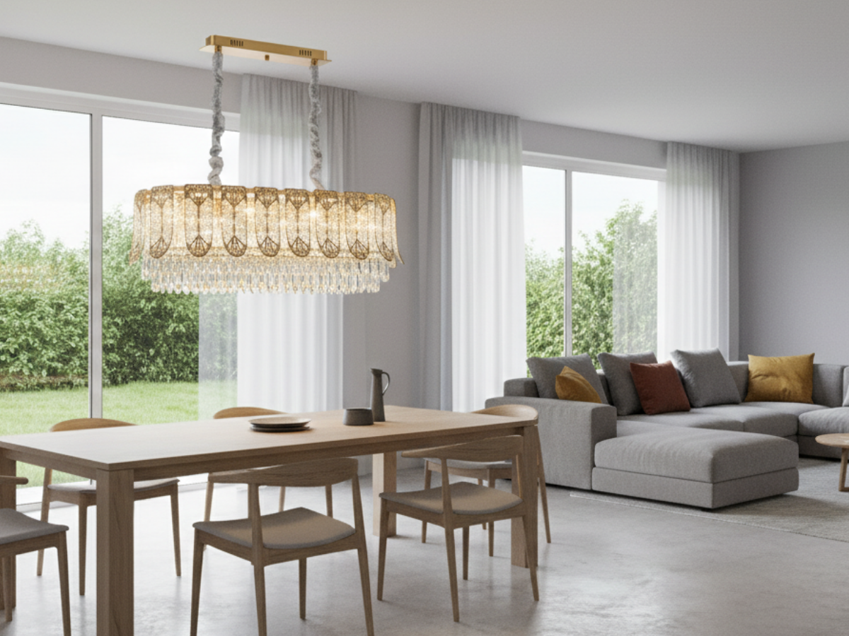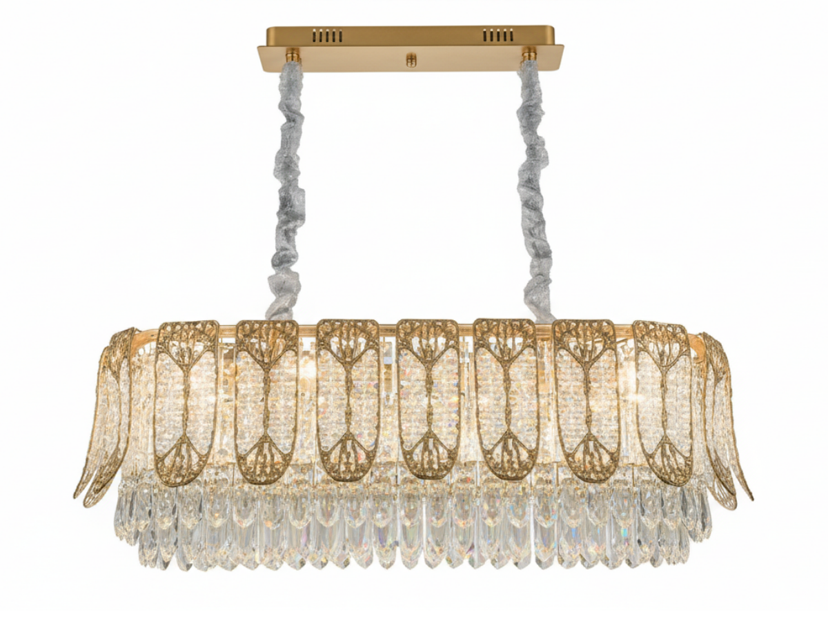 Diese luxuriöse Leuchte besticht durch ihre hochwertige Metallverarbeitung mit galvanischer Beschichtung und edle K9-Kristalle, die ein funkelndes Lichtspiel erzeugen.
