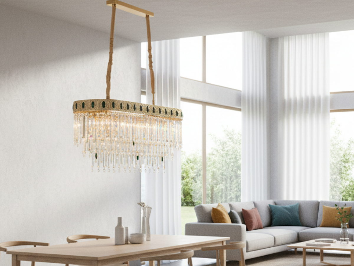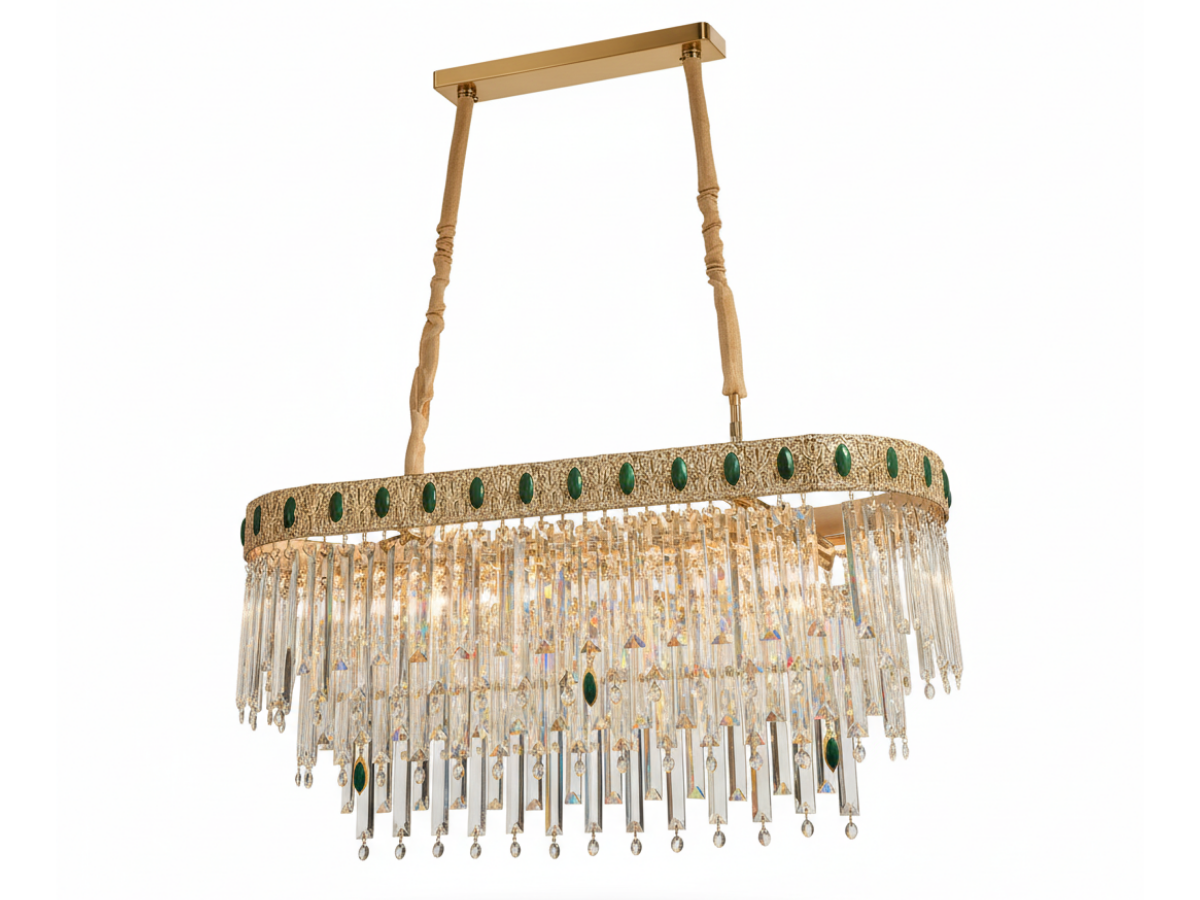 Das stabile Metallgestell sorgt für Langlebigkeit, während die Kristalle faszinierende Lichtreflexionen erzeugen – ideal für Wohn-, Ess- oder Empfangsbereiche.