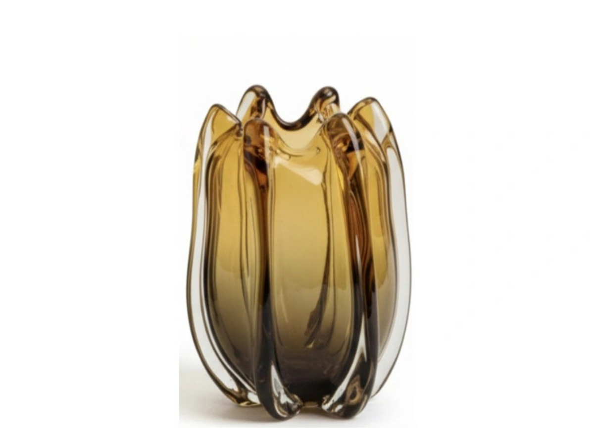 Diese handgefertigte Glasvase vereint warme Bernstein- und Rauchgrautöne zu einem eleganten Blickfang.