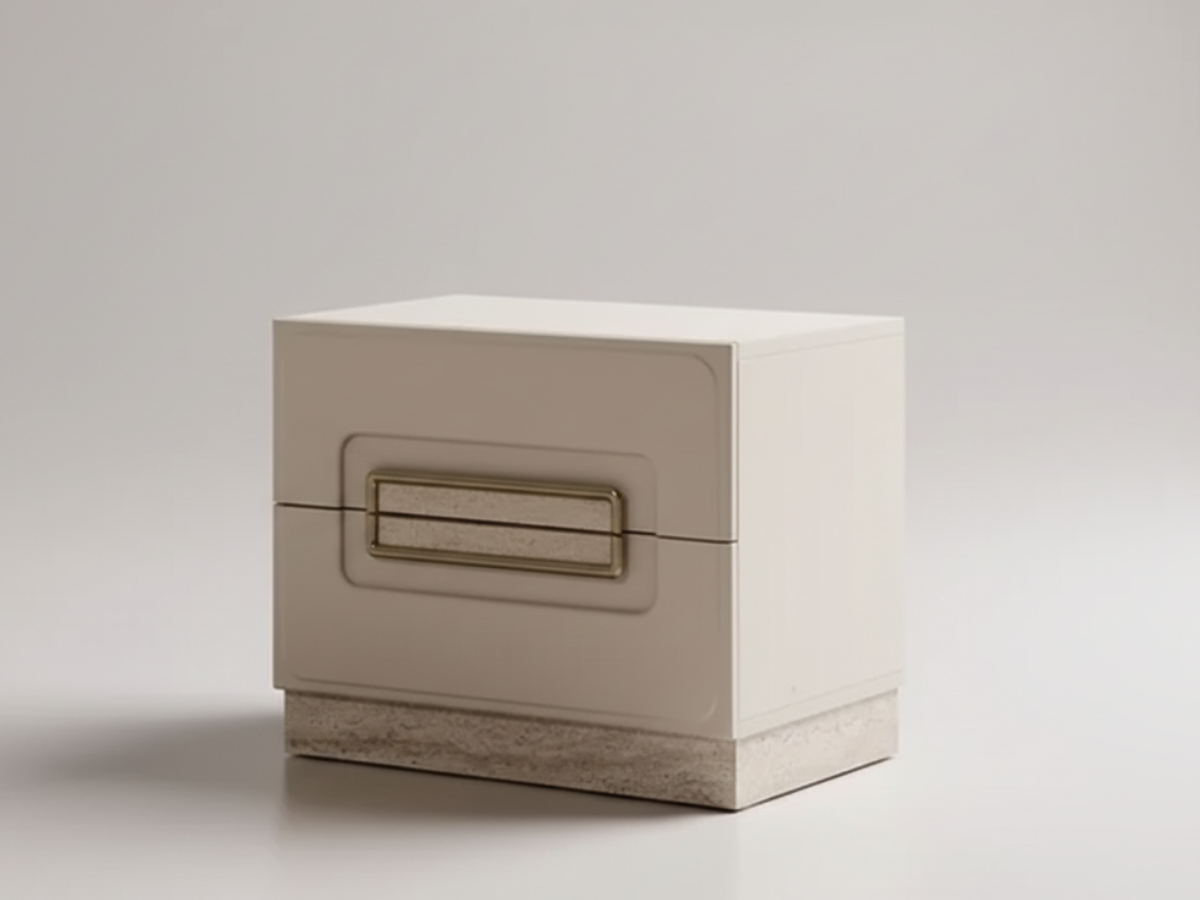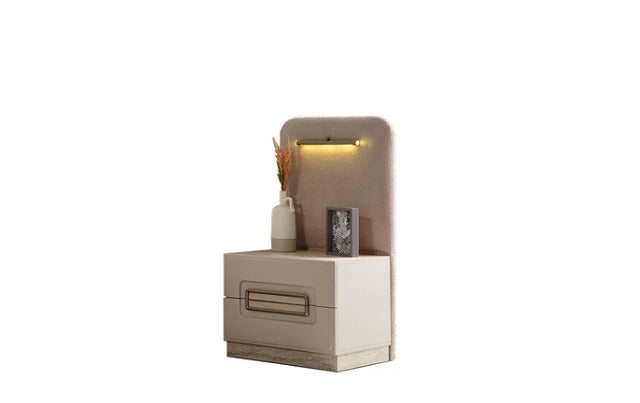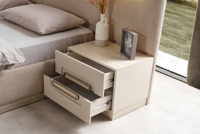 Die Akkor Nachtkommode überzeugt mit ihrem eleganten Design in sanften Pastelltönen und feinen Travertin-Optik-Details.