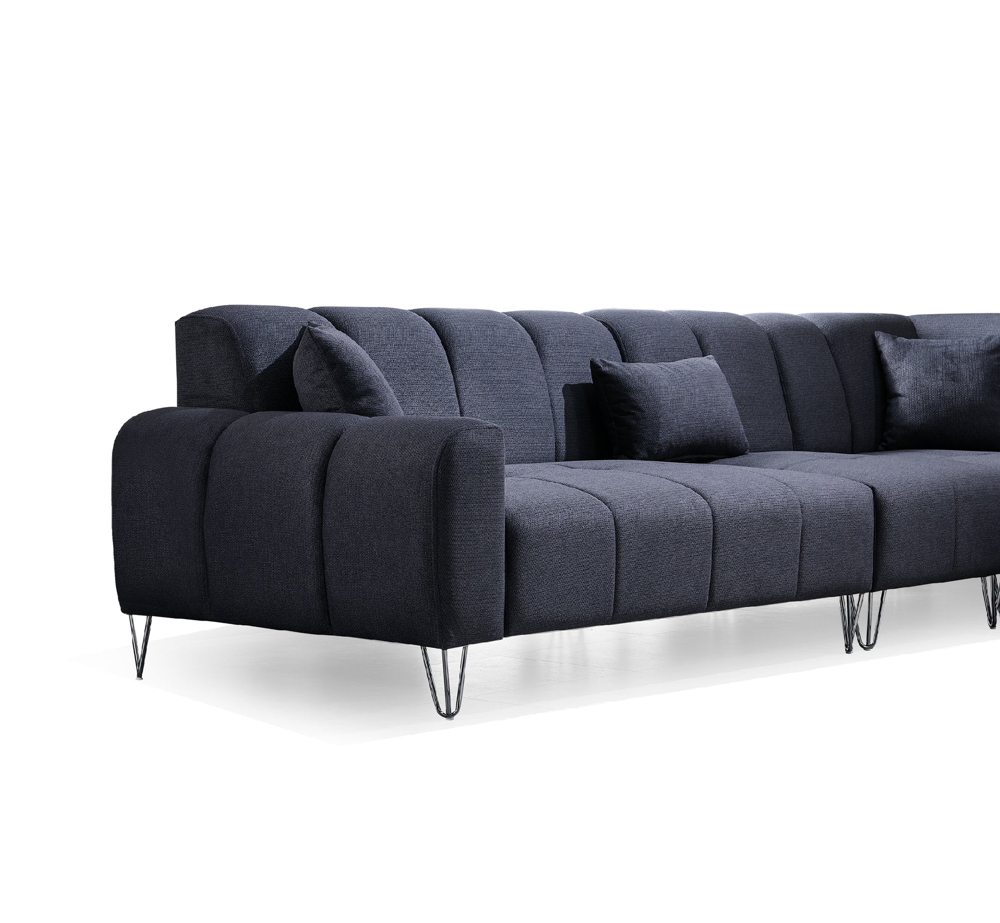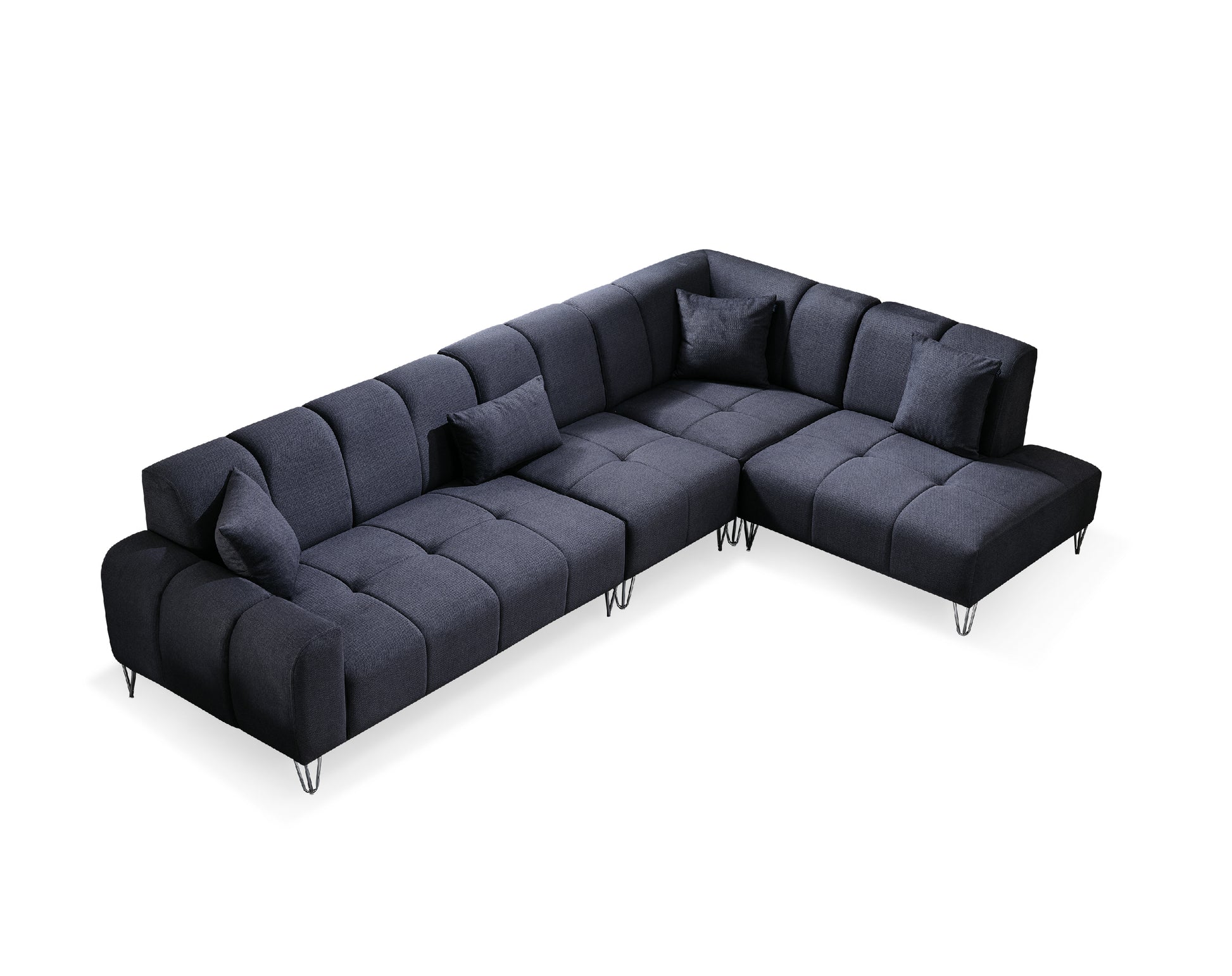 Modernes L-Ecksofa mit klarer Steppoptik und filigranen Metallfüßen. Für den täglichen Einsatz konzipiert: Die integrierte S-Wellenfederung (Es-Yay) hält die Polster dauerhaft formstabil und beugt Sitzmulden vor. Der Bezug ist atmungsaktiv und pflegeleicht – feucht abwischbar.