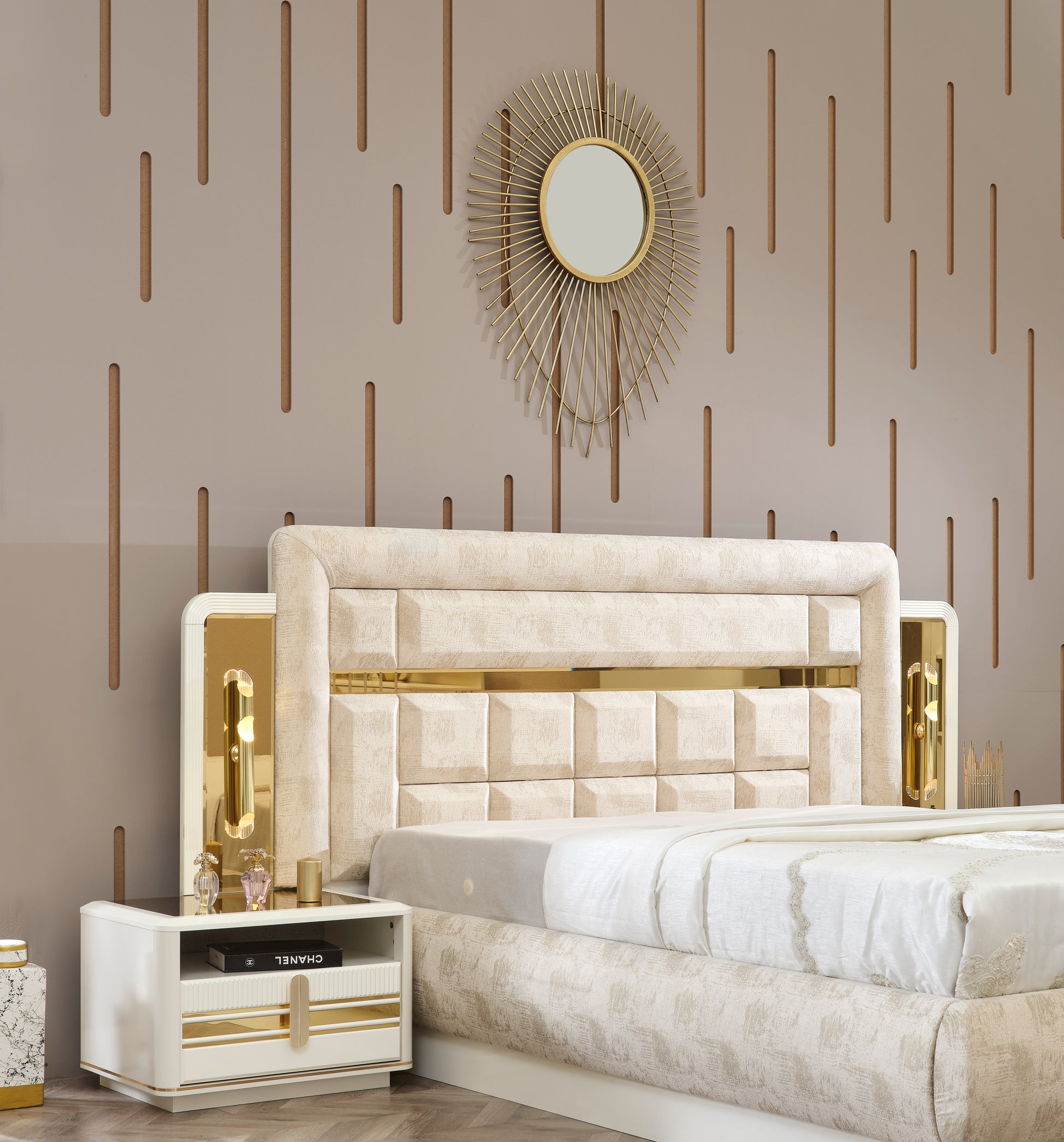 Die hochwertig lackierte MDF-Oberfläche in Beige wird durch goldfarbene Akzente und Spiegelelemente elegant ergänzt.