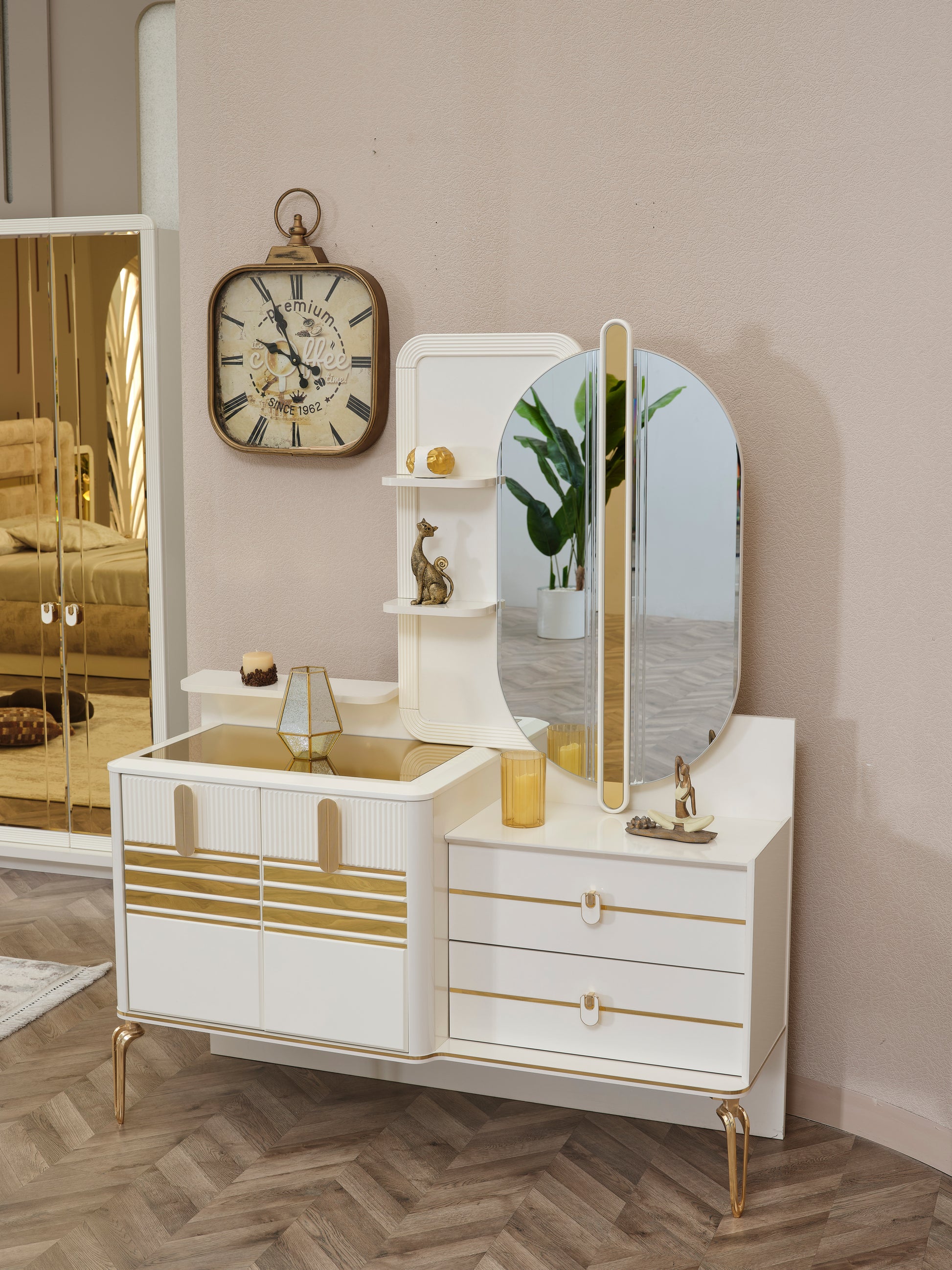 Der große, ovale Spiegel verleiht dem Raum Tiefe und Helligkeit, während die mehrere Ablageflächen und Schubladen ausreichend Platz für Kosmetik, Schmuck oder persönliche Accessoires bieten.