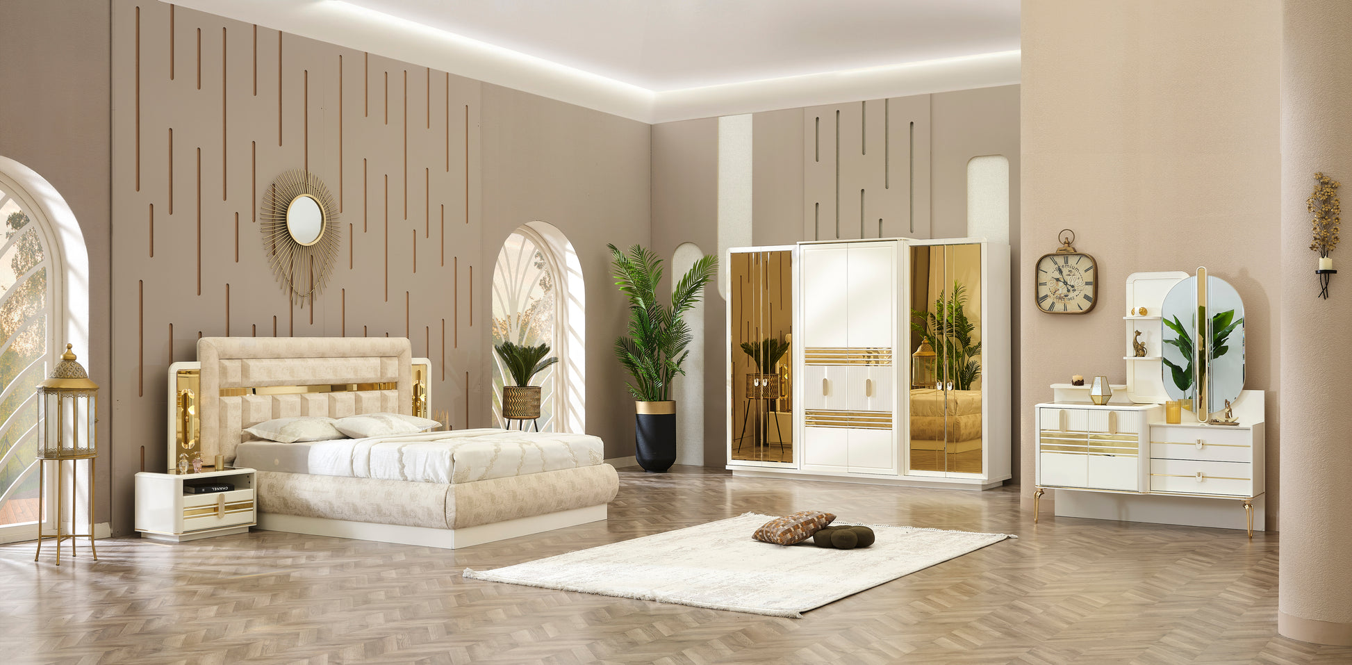 Das Design überzeugt durch seine harmonische Kombination aus beigefarbener, farbig beschichteter MDF-Oberfläche und goldfarbenen Metallakzenten, die für einen luxuriösen Look sorgen.