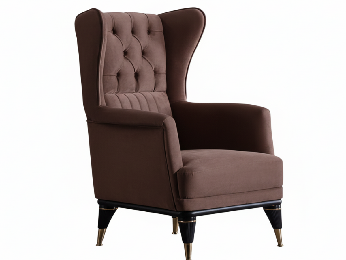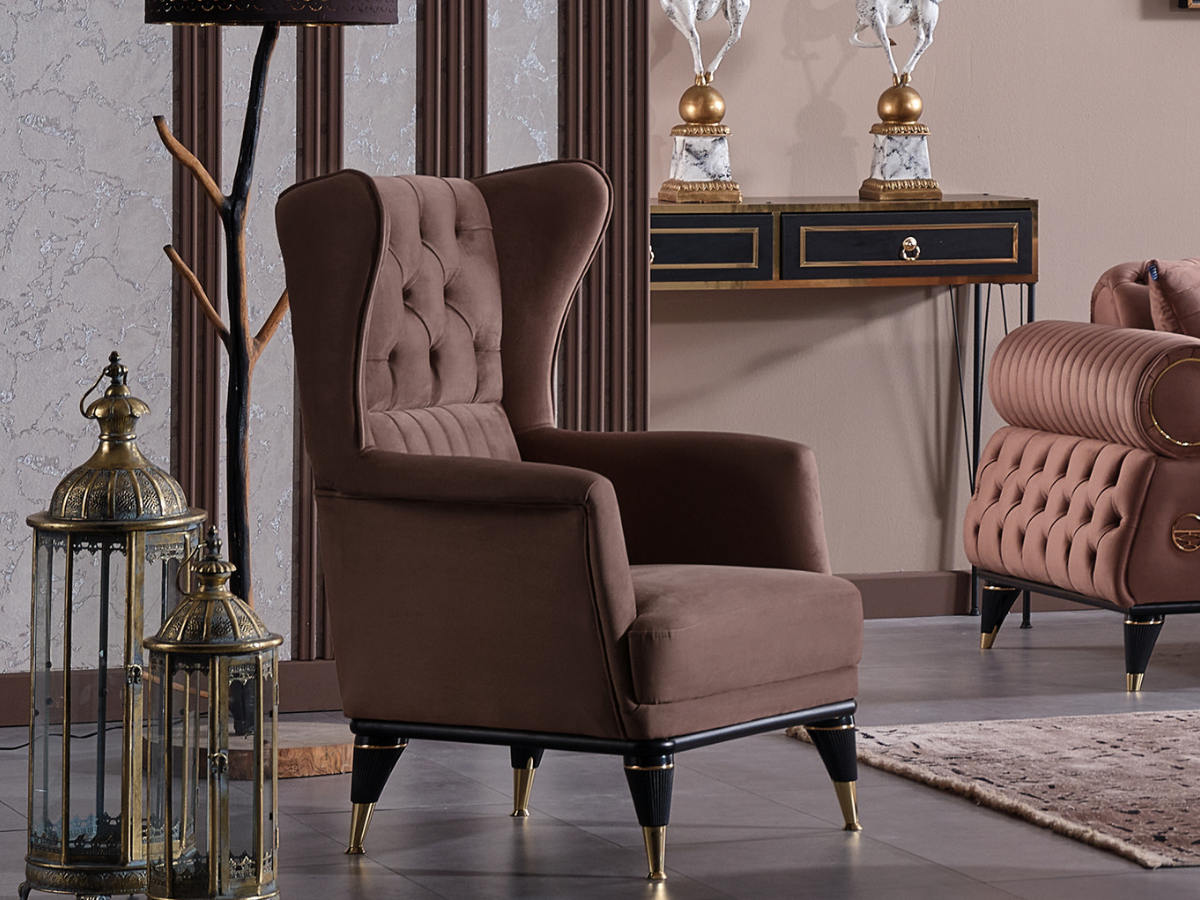 Madrid berjer, zarif kadife döşeme, klasik kapitone (Chesterfield) detayları ve şık metal ayaklarla göz alıcı bir tekli koltuktur. Yüksek sırt yapısı ve formunu koruyan süngeriyle dengeli ve konforlu bir oturum sunar.