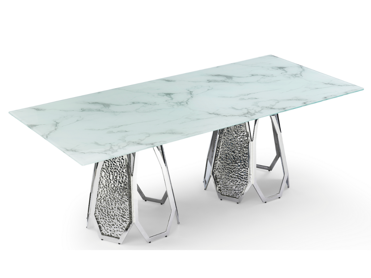 Der Butterfly Esstisch bietet Ihnen die Wahl zwischen zwei eleganten Varianten: Gold und Silber. Die sechseckigen Fußteile mit goldenen oder silbernen Akzenten verleihen diesem Esstisch eine luxuriöse Ausstrahlung. Die Oberfläche besteht aus hochwertigem, gemustertem Glas, das nicht nur elegant aussieht, sondern auch widerstandsfähig gegen Kratzer und Brüche ist.