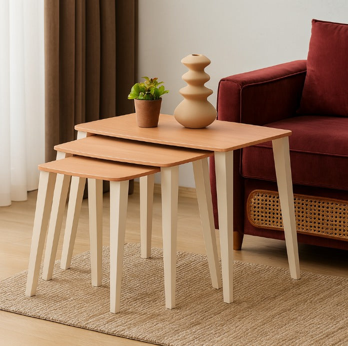 Das Eylül Beistelltisch-Set vereint die warme Ausstrahlung von Holz mit den sanften Creme-Nuancen und bringt eine moderne, harmonische Eleganz in Ihr Zuhause. Die abgerundeten Kanten und klaren Linien sorgen für ein dezentes, zeitloses Design.