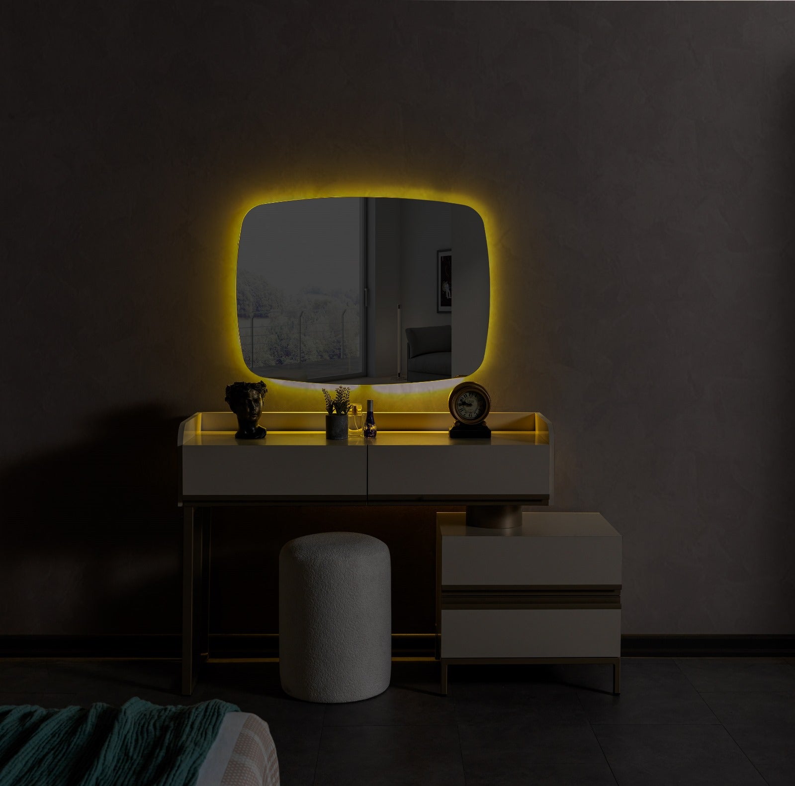 Das Eylül Schlafzimmer Set bringt mit seinem eleganten Design, dem weich gepolsterten Bettkopfteil und den warmen Farben eine angenehme Wohlfühlatmosphäre in Ihr Schlafzimmer. Das Bett verfügt über ein praktisches Bettkastensystem für zusätzlichen Stauraum. Der geräumige Kleiderschrank mit Spiegel-Fronten und die stilvollen Kommoden runden das Set harmonisch ab.