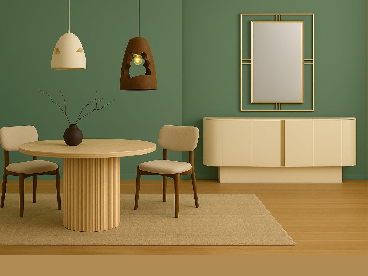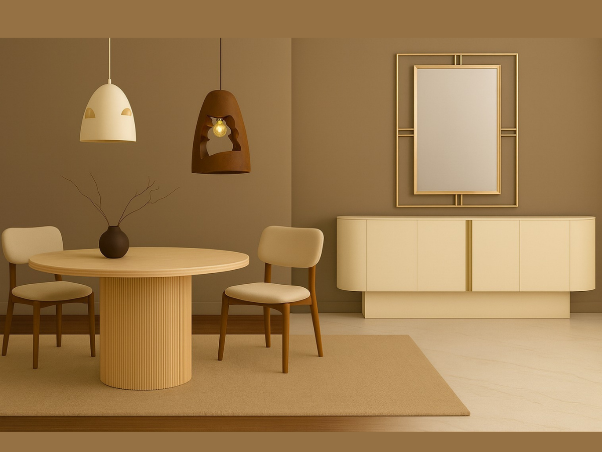 Das Esszimmer-Set vereint elegantes Design mit hochwertiger Verarbeitung und praktischer Funktionalität. Im Set enthalten sind ein runder Esstisch mit Tischplatte in Travertin-Optik (beschichtete Oberfläche, kein Naturstein), vier stilvolle Stühle sowie ein passendes Sideboard. Perfekt für moderne Essbereiche, offene Küchen oder stilvolle Lofts.