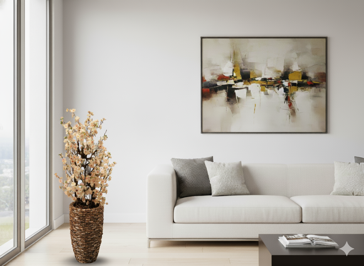 Repräsentatives Deko-Arrangement mit naturgetreuen Kirschblüten auf Ästen in einer hohen Steinvase mit Perlmutt-Mosaik. Pflegeleicht, langlebig und ganzjährig schön – ideal als Blickfang im Wohn- oder Eingangsbereich.