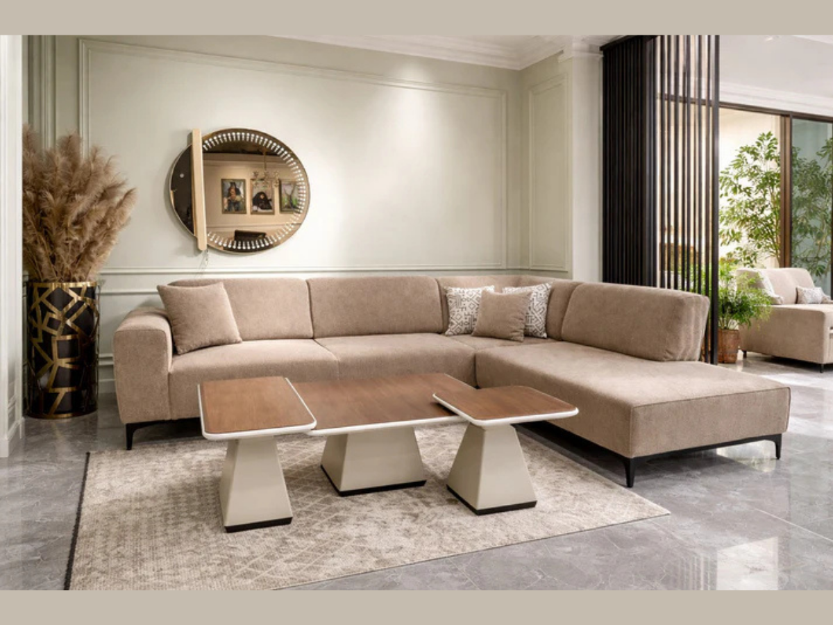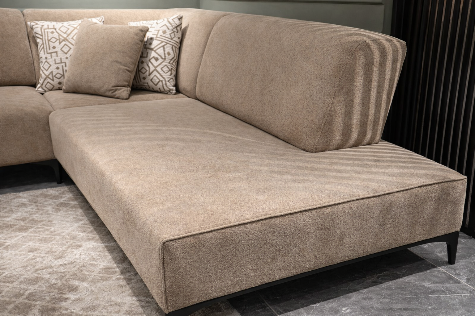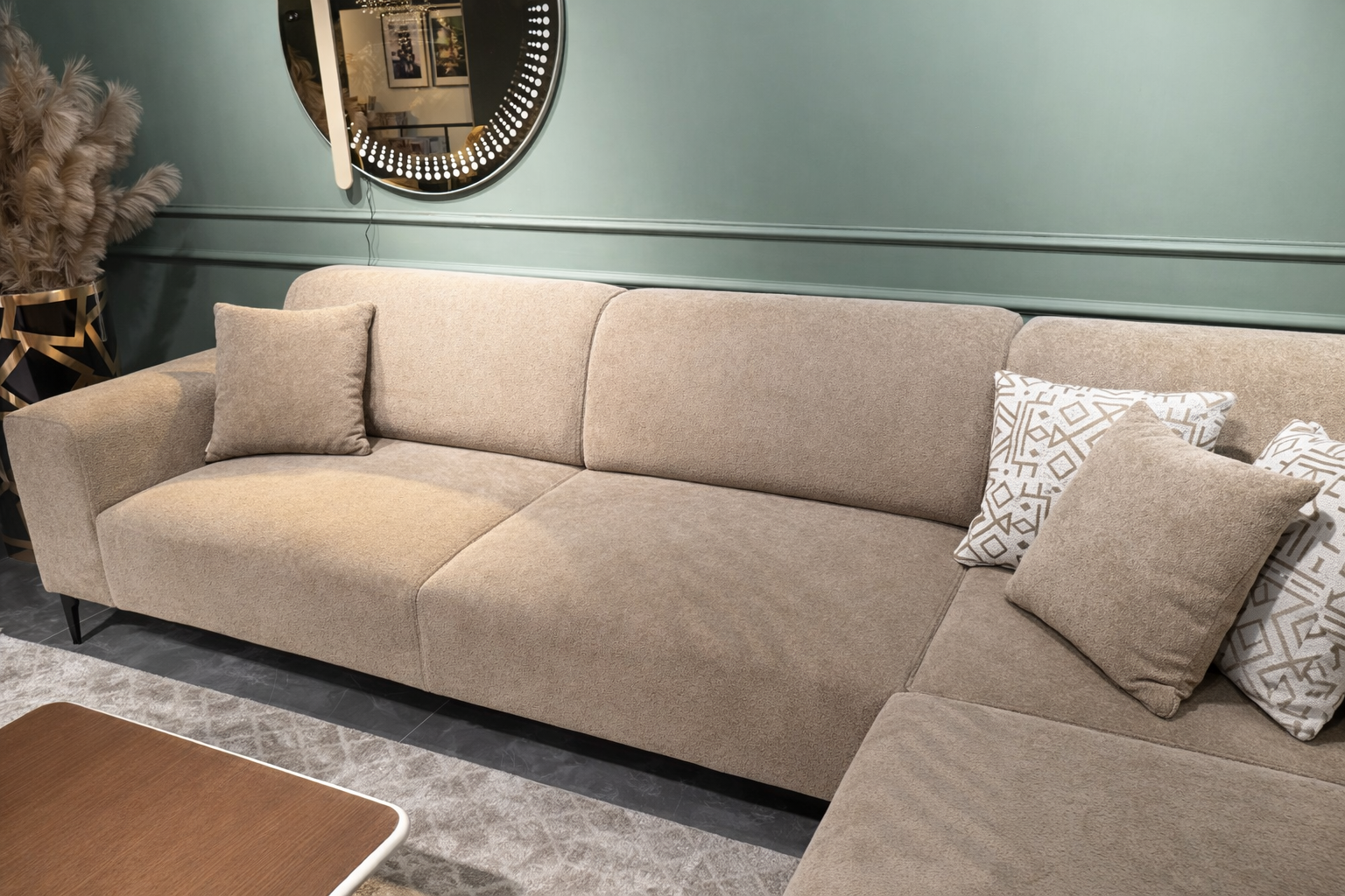 Diese moderne Eckcouchgarnitur überzeugt durch ihr zeitloses Design, hohen Sitzkomfort und flexible Anpassungsmöglichkeiten. Dank der integrierten S-Wellenfederung (Es-Yay) bietet das Sofa eine gleichmäßige Unterstützung und angenehmen Komfort im Alltag.
