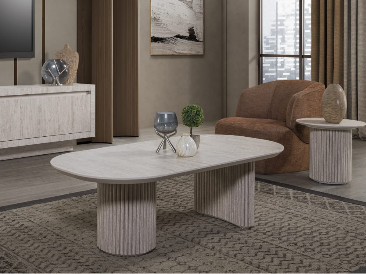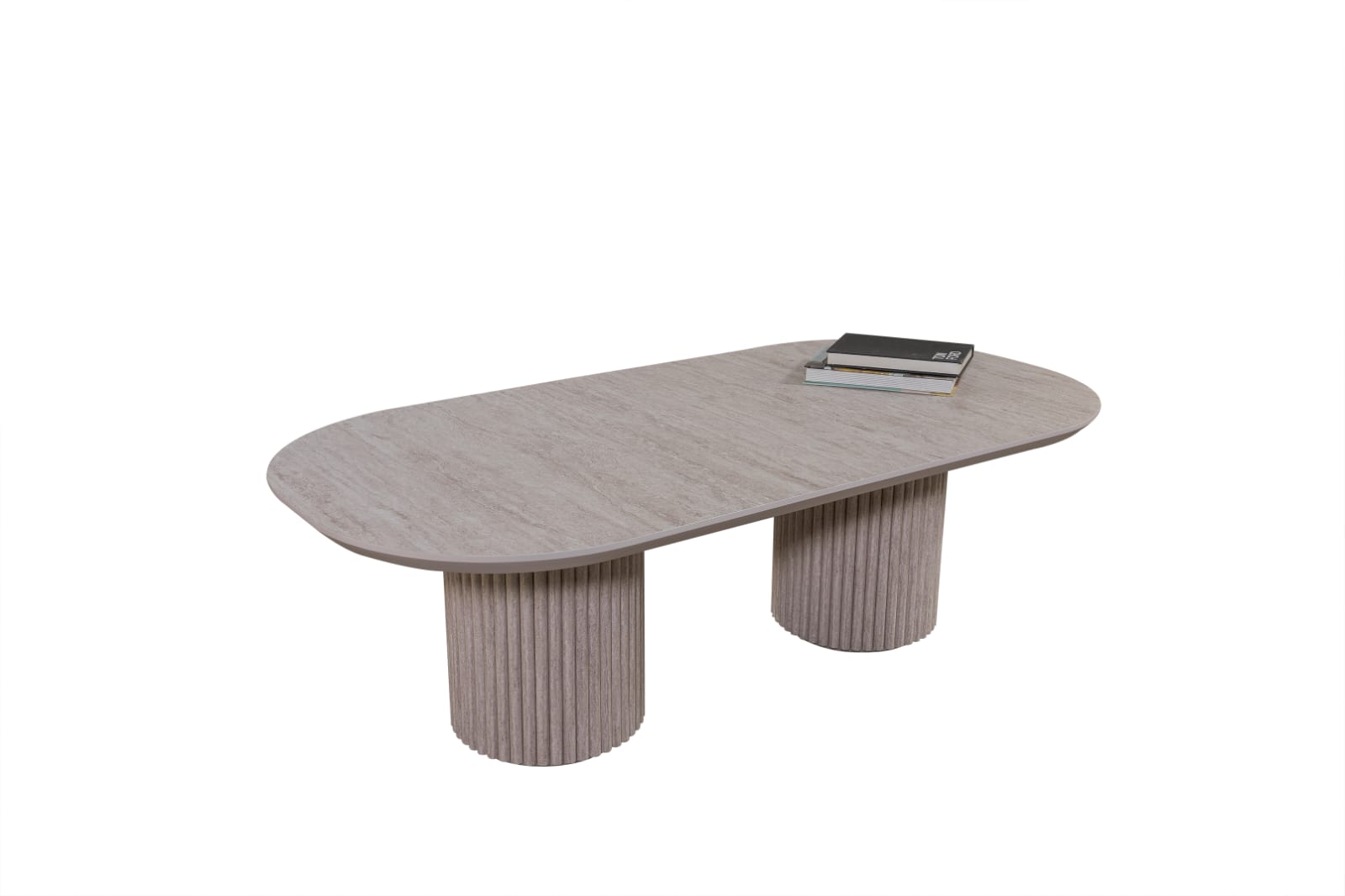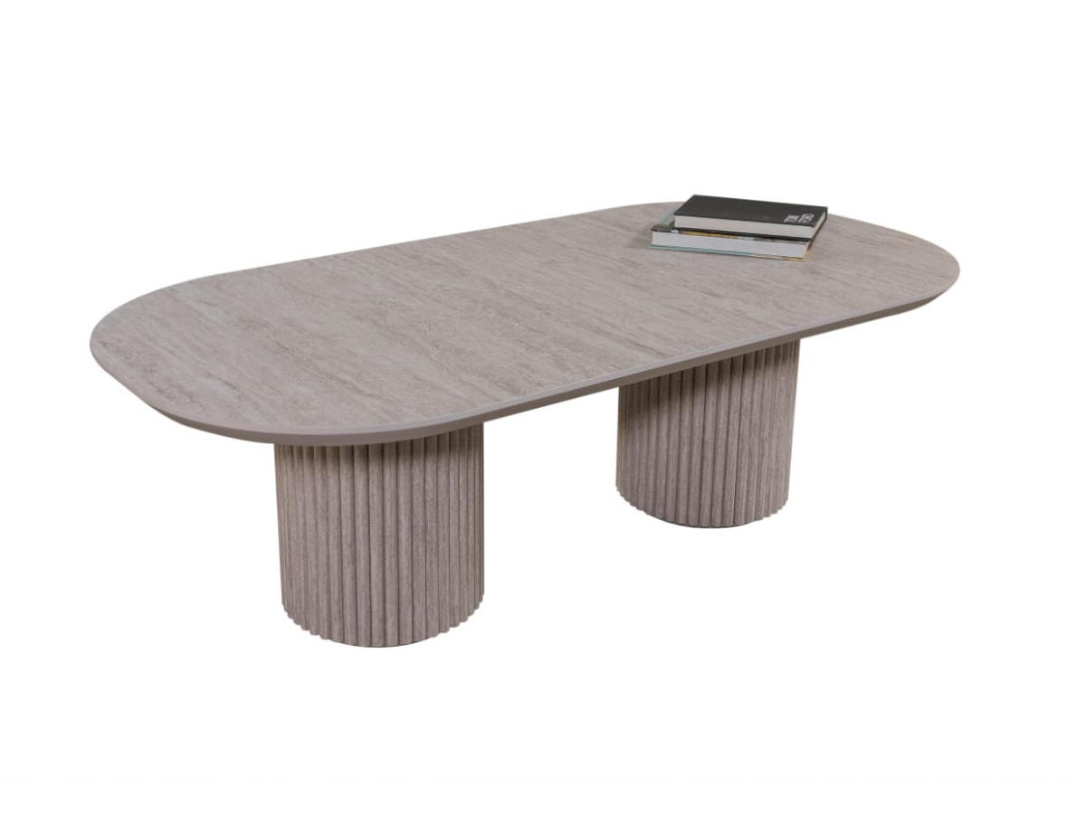 Ein moderner Couchtisch mit einzigartigem Charakter: Der Hawai Couchtisch besticht durch seine abgerundete Rechteckform, die geriffelten Rundsäulen als Tischbeine und seine edle Travertin-Optik. Perfekt für alle, die ein stilvolles Statement im Wohnzimmer setzen möchten.