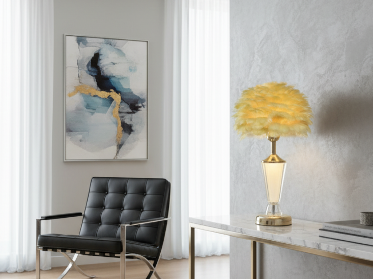 Gefertigt aus Metall, Acryl und zarten Feder-Details, sorgt sie für eine warme und stilvolle Atmosphäre in jedem Raum.