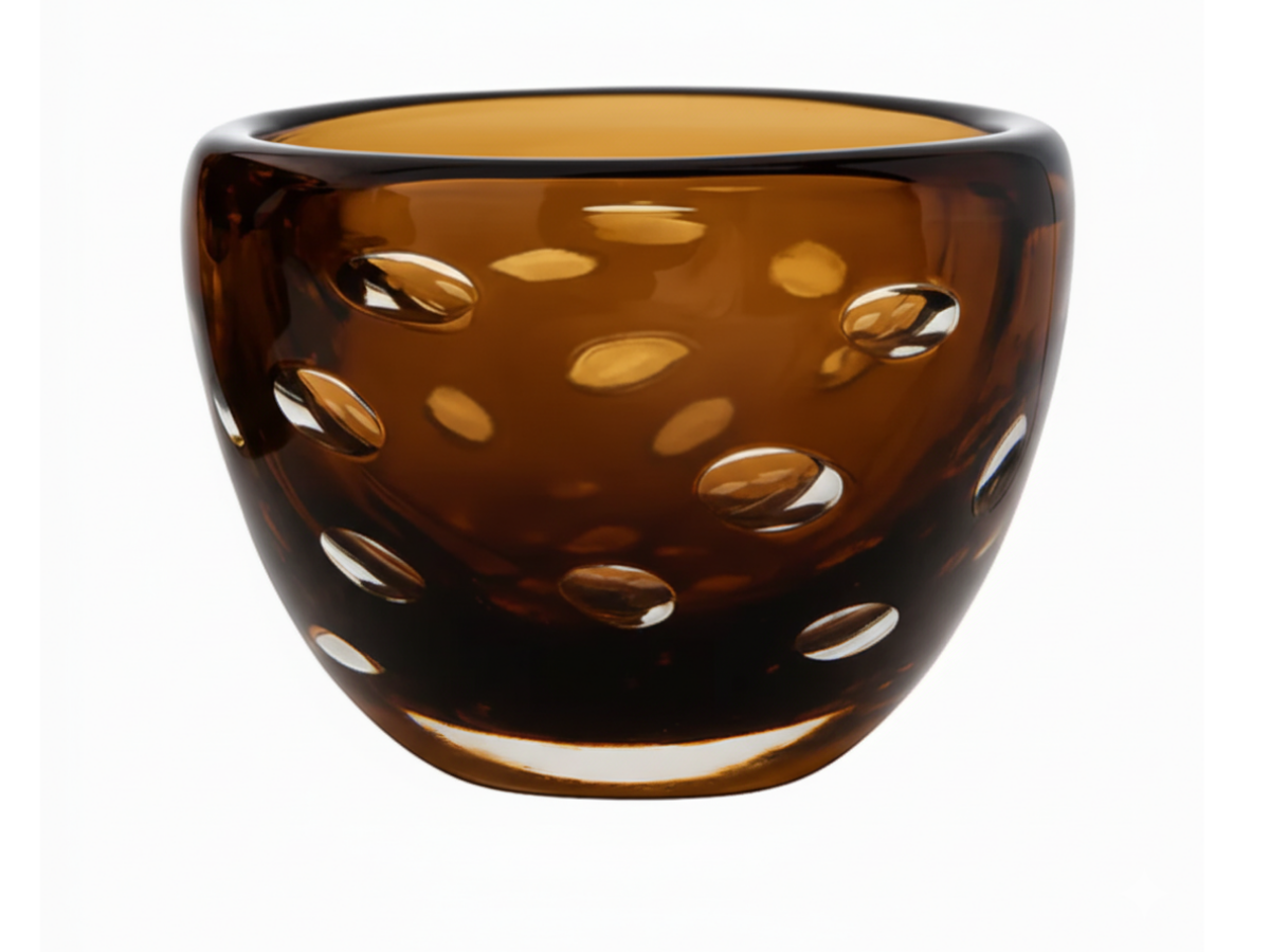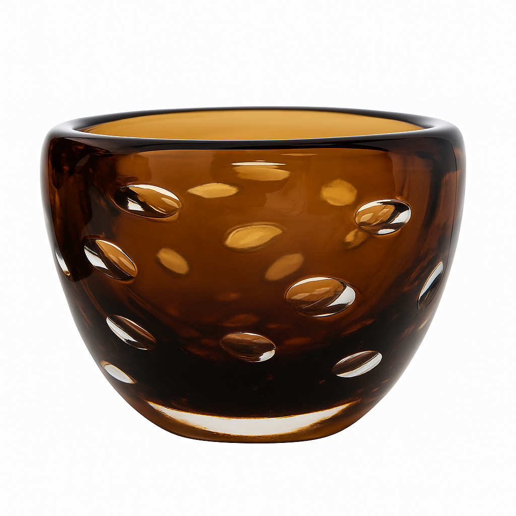 Zeitlose, dickwandige Glas-Schale in warmem Amberton. Die ovalen, eingeschmolzenen Bläschen verleihen eine lebendige Optik und machen jedes Stück einzigartig – ideal für Sideboard, Couchtisch oder als Teelicht-/Potpourri-Schale.