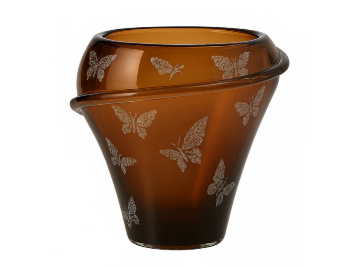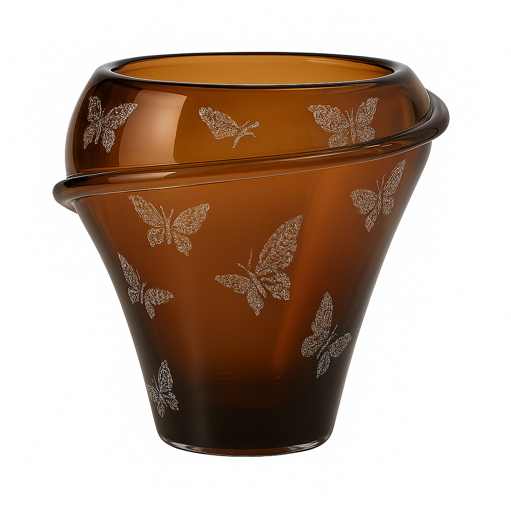 Elegante Dekovase aus massivem Glas in warmem Amberton. Feine Schmetterlings-Gravuren und der umlaufende Glasring verleihen dem Stück Tiefe und einen hochwertigen Handmade-Look – ideal für Sideboard, Couchtisch oder Konsole.