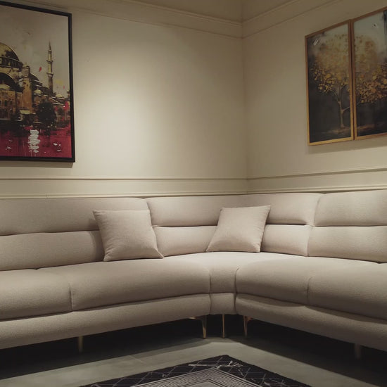 Das Ibiza Ecksofa kombiniert weiche, abgerundete Formen mit eleganten Metallfüßen in Gold und bietet langlebigen Sitzkomfort für den Alltag.