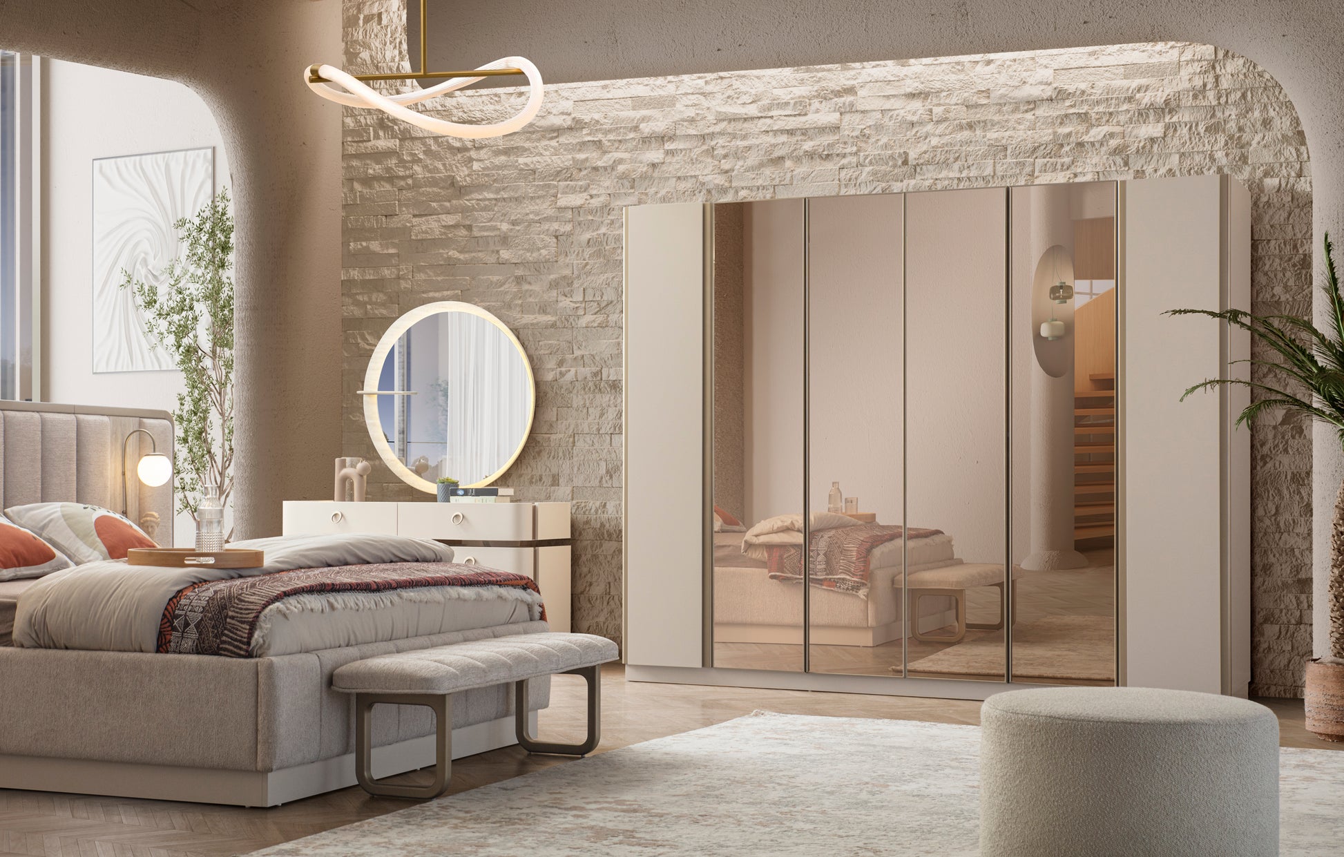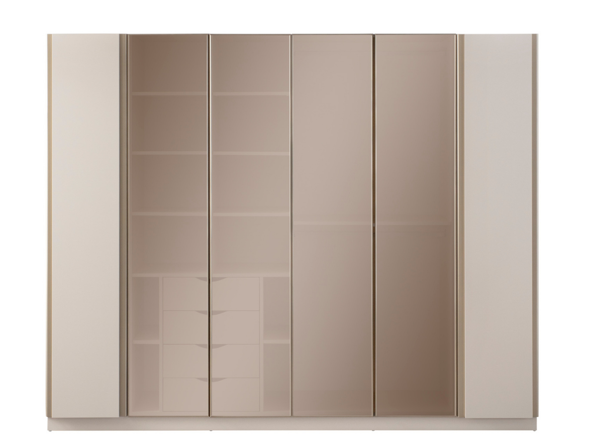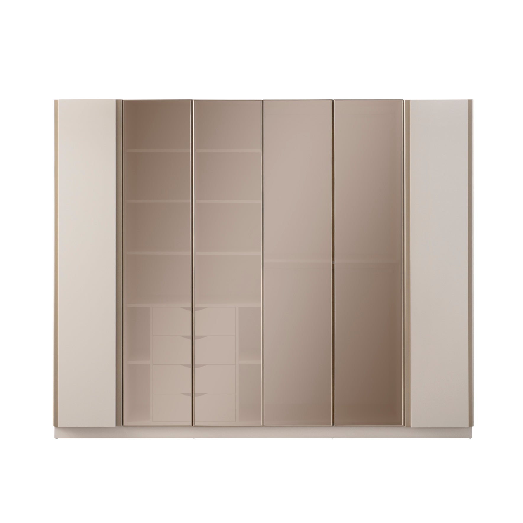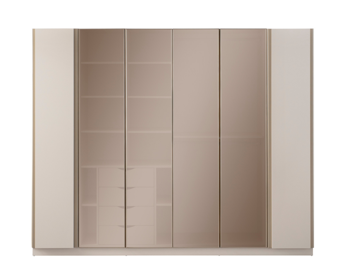 Der moderne Kleiderschrank beeindruckt mit seiner eleganten Kombination aus Bronze-Spiegeltüren und lackierten MDF-Fronten.