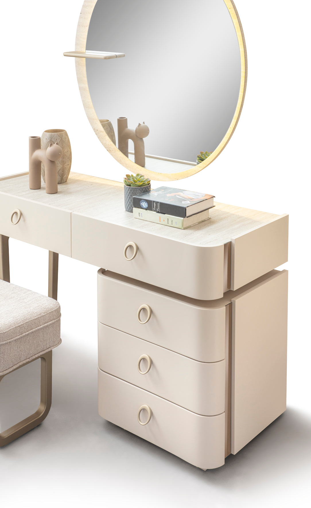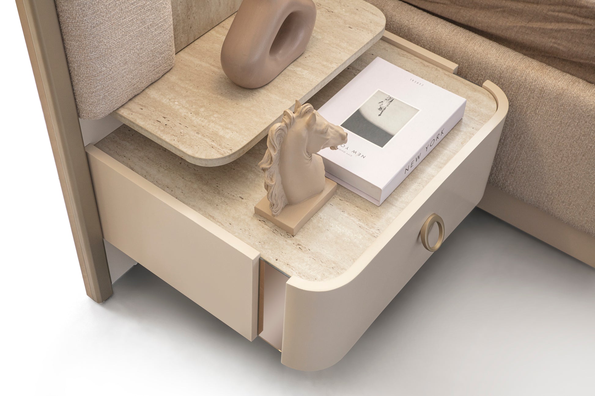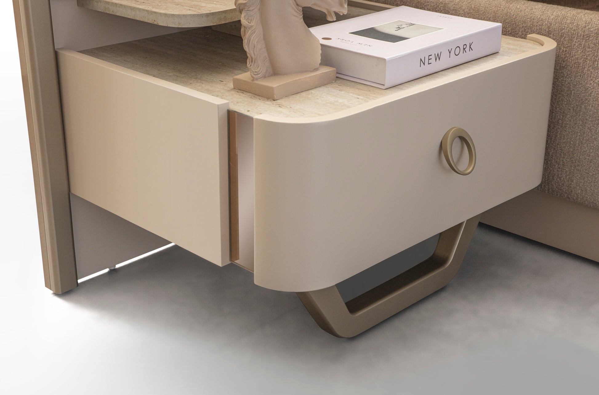 Nachttische & Schminktisch: Travertin-Dekor-Oberflächen, MDF-Korpus, Metallgriffe und Metallfüße