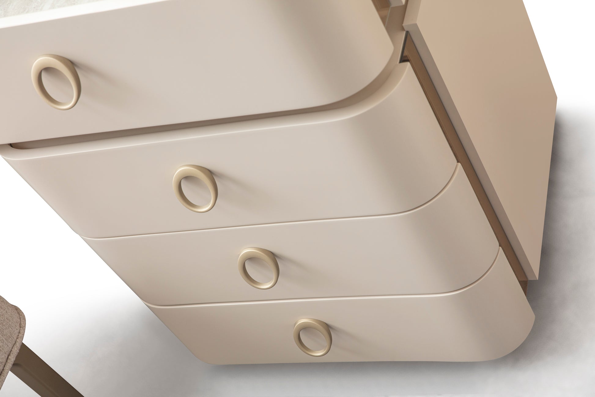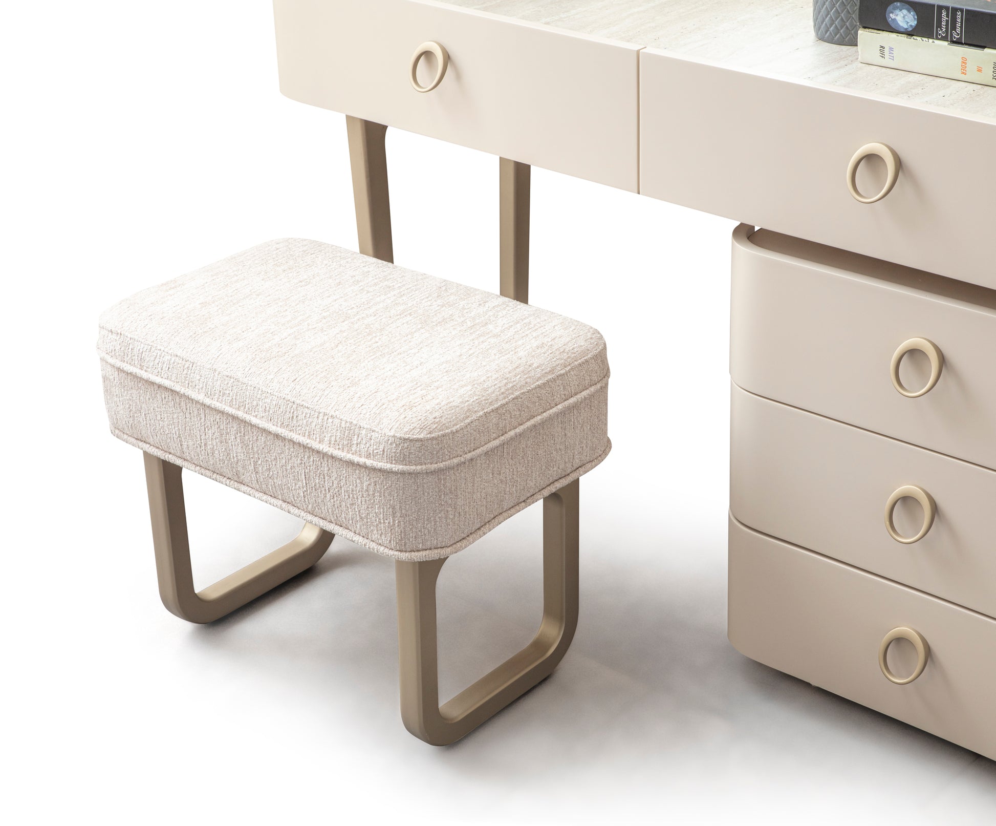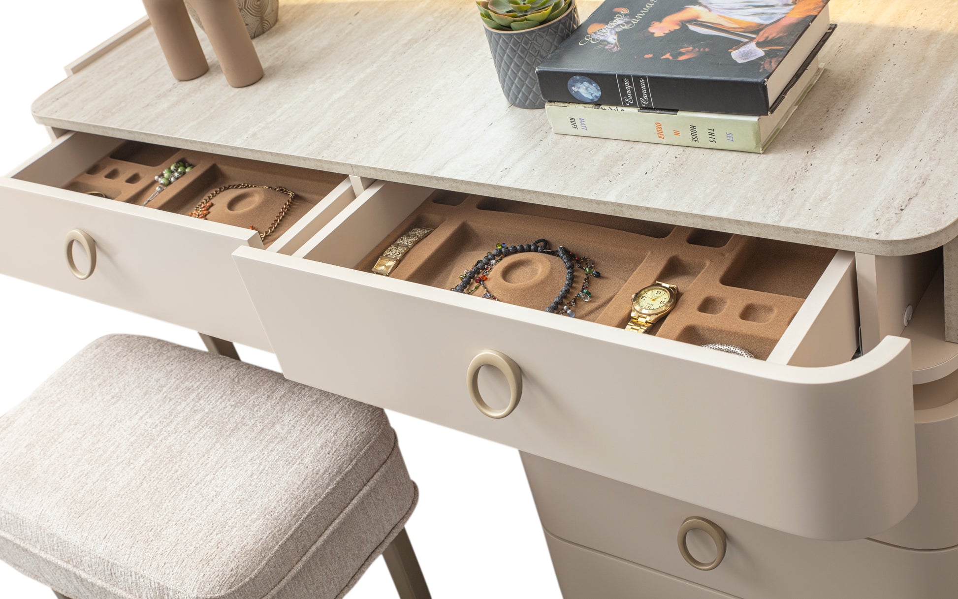Nachttische & Schminktisch: Travertin-Dekor-Oberflächen, MDF-Korpus, Metallgriffe und Metallfüße