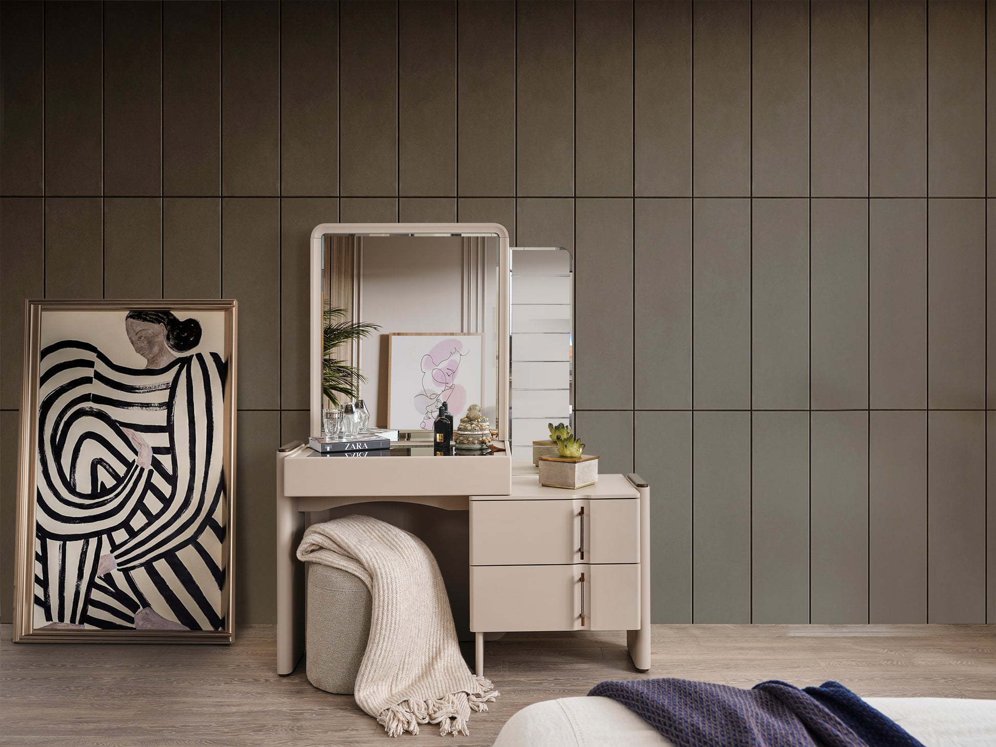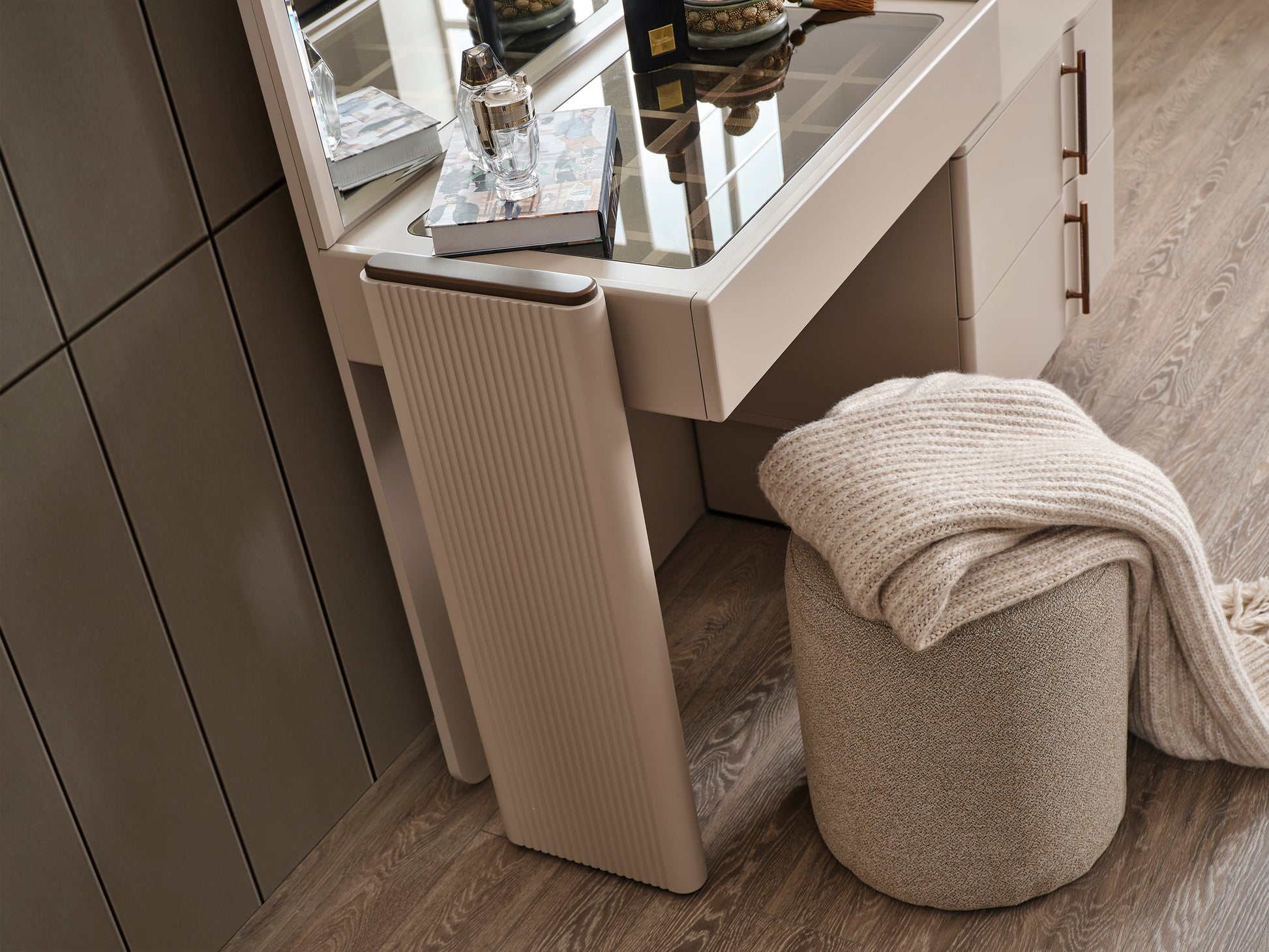 Dank der cleveren Schubladenaufteilung und der großzügigen Spiegelfläche ist sie ideal zum Schminken und Stylen geeignet. Die feinen Linien, der strukturierte Seitenteil und die hochwertigen Metallgriffe sorgen für einen luxuriösen Look.