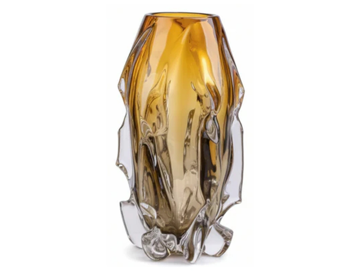 Diese handgefertigte Glasvase vereint Bernstein- und Rauchgrautöne zu einem luxuriösen, modernen Look.