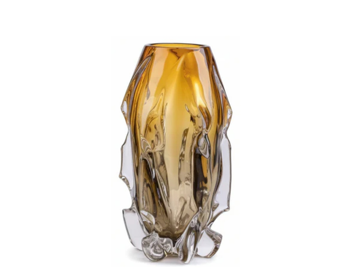 Handgefertigte Glasvase mit sanftem Verlauf in Bernstein- und Rauchgrautönen – ein eleganter Akzent für moderne Räume.