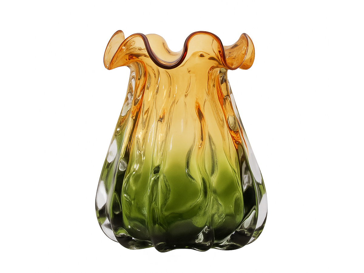 Diese dekorative Glasvase aus der Kollektion 2026 besticht durch ihre organische Form und den eleganten Farbverlauf von Amber zu Grün. Die gewellte Glasstruktur reflektiert das Licht auf edle Weise und macht die Vase zu einem modernen Kunstobjekt – ob solo oder mit Blumenarrangement.