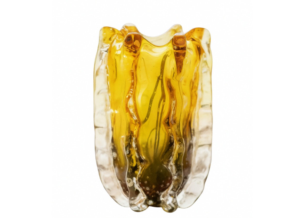 Diese Vase zeichnet sich durch einen warmen Amber-/Honigfarbton aus, der sanft in ein leicht olivgrünes Schimmern übergeht – also nicht vollständig grün, sondern eher wie ein „Honig-Kuss“ (Amber Kiss) mit natürlicher Tiefe. Die organisch geschwungene Glasform reflektiert das Licht elegant und macht jedes Stück einzigartig.