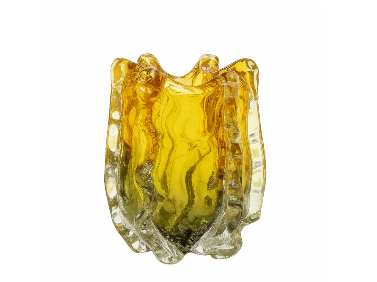 Diese Vase zeichnet sich durch einen warmen Amber-/Honigfarbton aus, der sanft in ein leicht olivgrünes Schimmern übergeht – also nicht vollständig grün, sondern eher wie ein „Honig-Kuss“ (Amber Kiss) mit natürlicher Tiefe. Die organisch geschwungene Glasform reflektiert das Licht elegant und macht jedes Stück einzigartig.