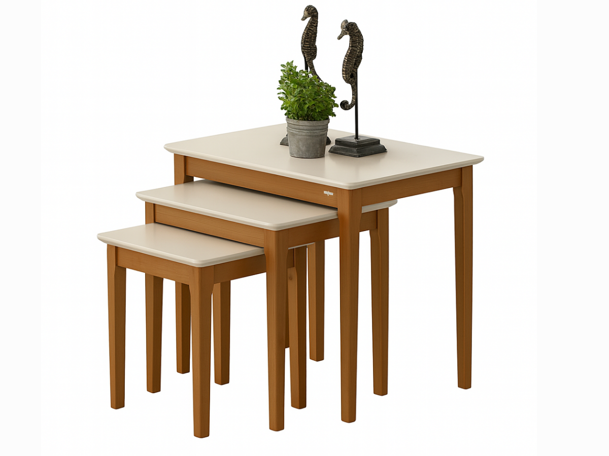 Die drei Tische lassen sich vollständig ineinanderschieben und bieten vielseitige Einsatzmöglichkeiten im Wohnzimmer, im Gästezimmer oder im Wartebereich.
