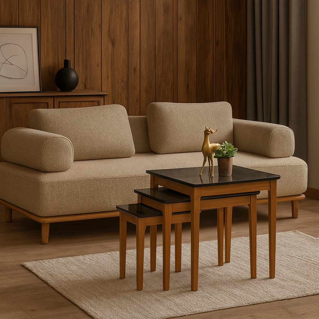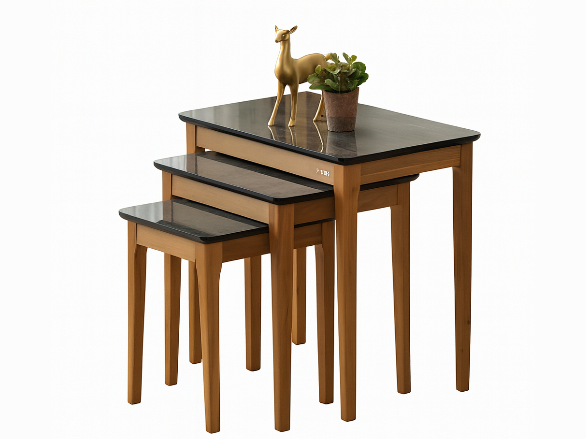 Die drei Tische sind vollständig ineinander schiebbar und bieten maximale Platzersparnis.