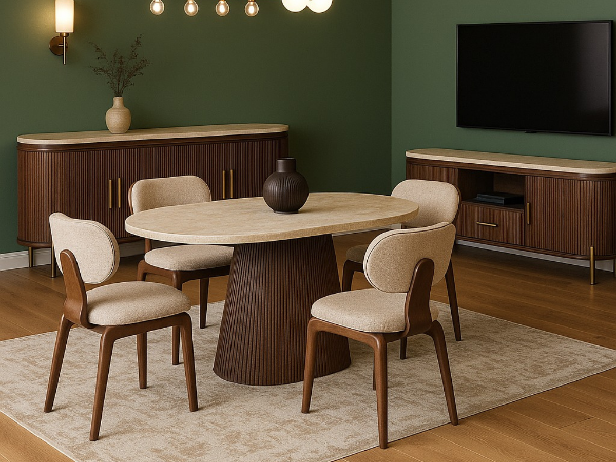 Der Kimberly Esstisch Oval verbindet eine edle Tischplatte in Travertin-Optik (beschichtete Oberfläche, kein Naturstein) mit einer harmonischen, ovalen Form – ein zeitloses Highlight für moderne Wohn- und Essbereiche.