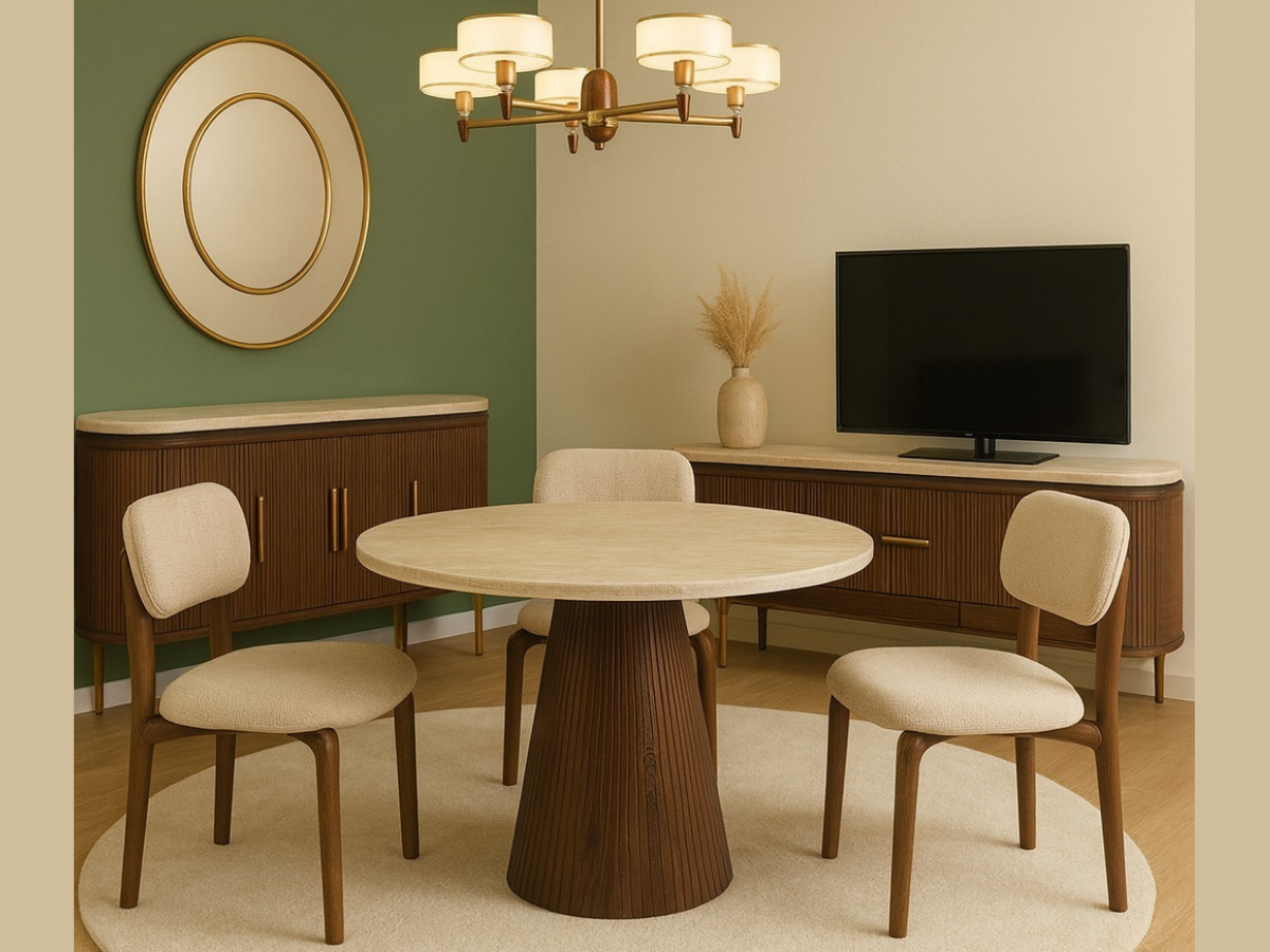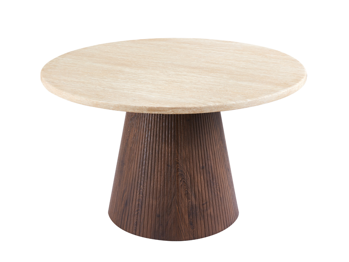Seine runde Form schafft ein harmonisches Raumgefühl, während die Tischplatte in Marmoroptik mit digitaler Travertin-Beschichtung dem Tisch eine luxuriöse Ausstrahlung verleiht.