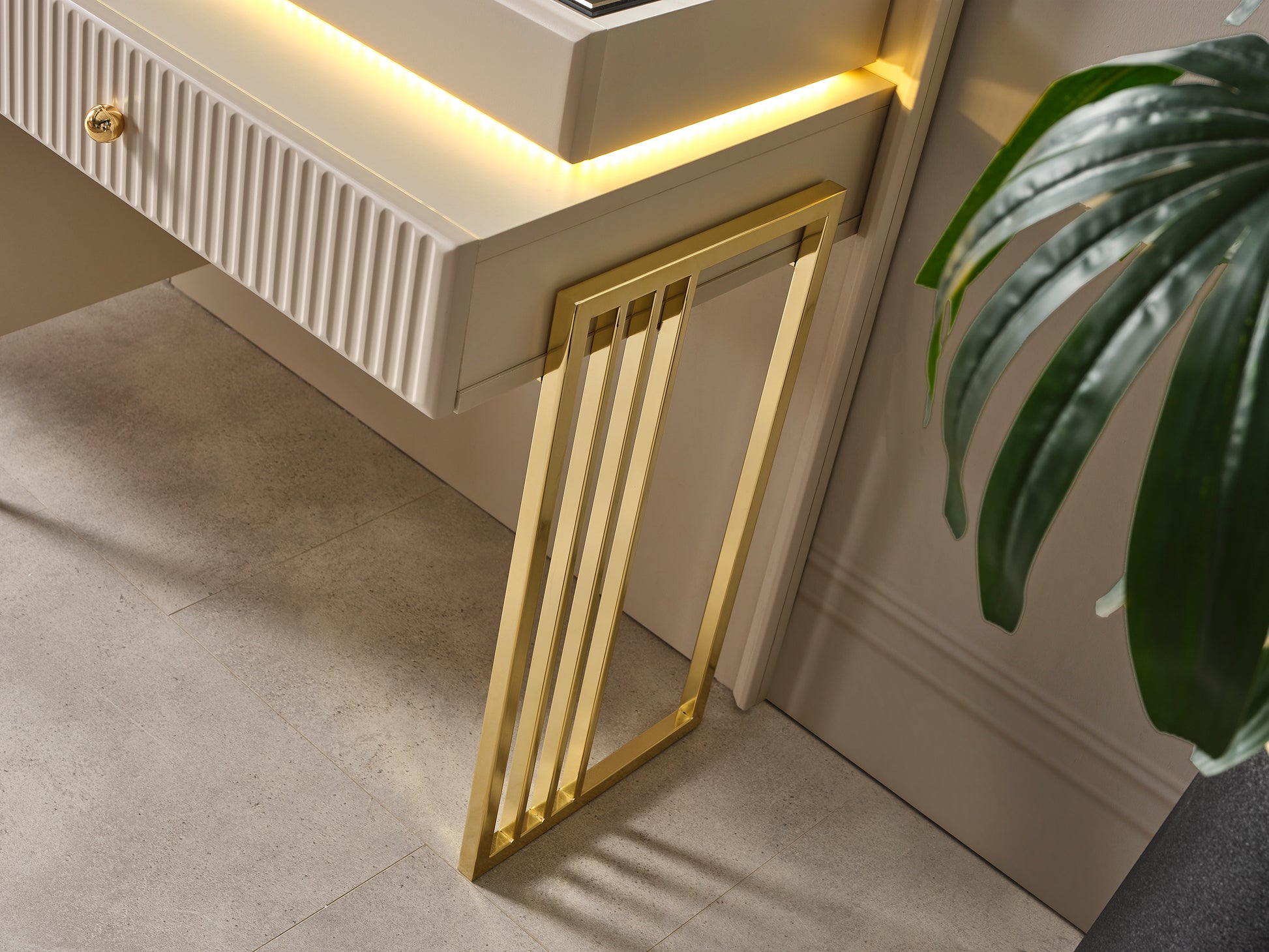 Mit ihren goldfarbenen Details, der feinen LED-Beleuchtung und dem großzügigen Spiegel schafft sie eine edle Atmosphäre und bietet zugleich praktischen Stauraum für Make-up, Schmuck und Accessoires.