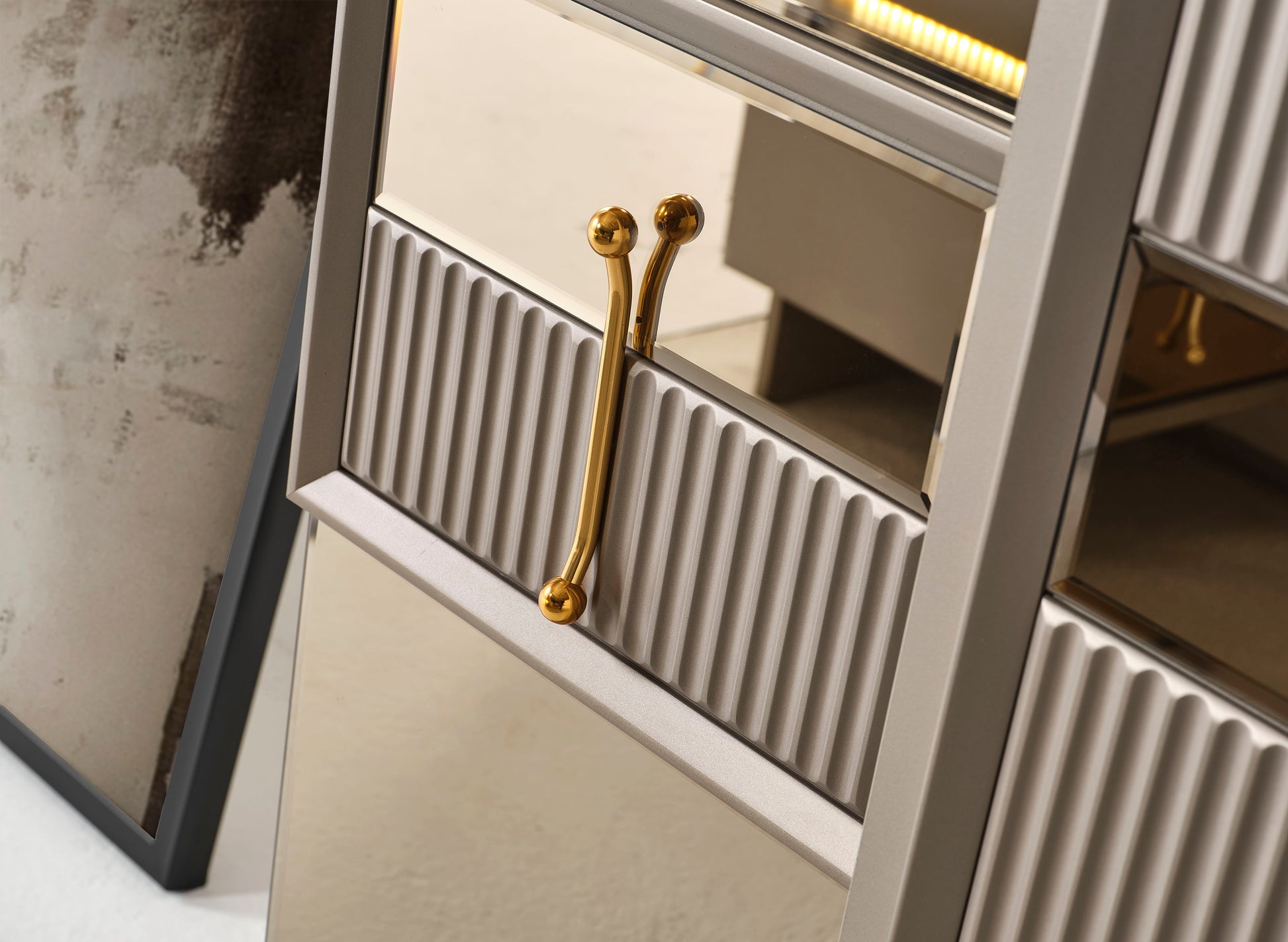 Die Kombination aus grauen, vertikal gerillten Fronten und goldfarbenen Details verleiht dem Schrank einen modernen, luxuriösen Charakter.