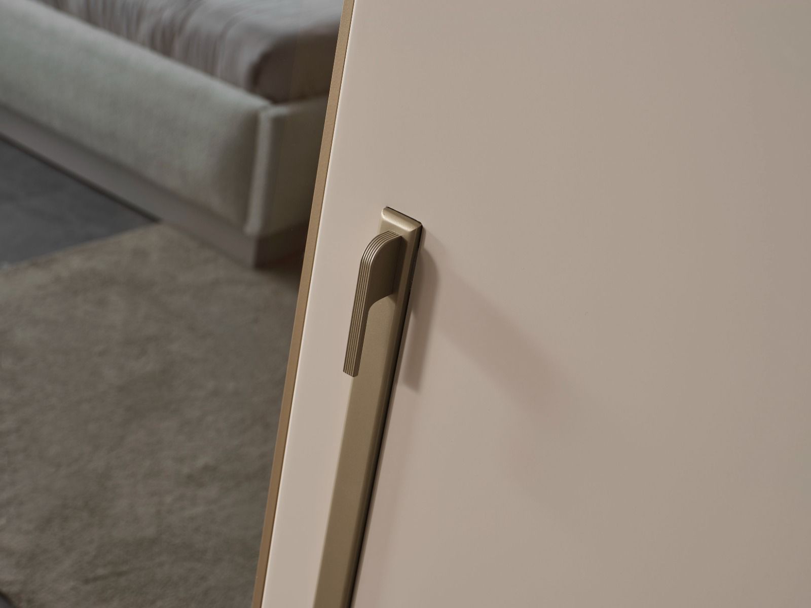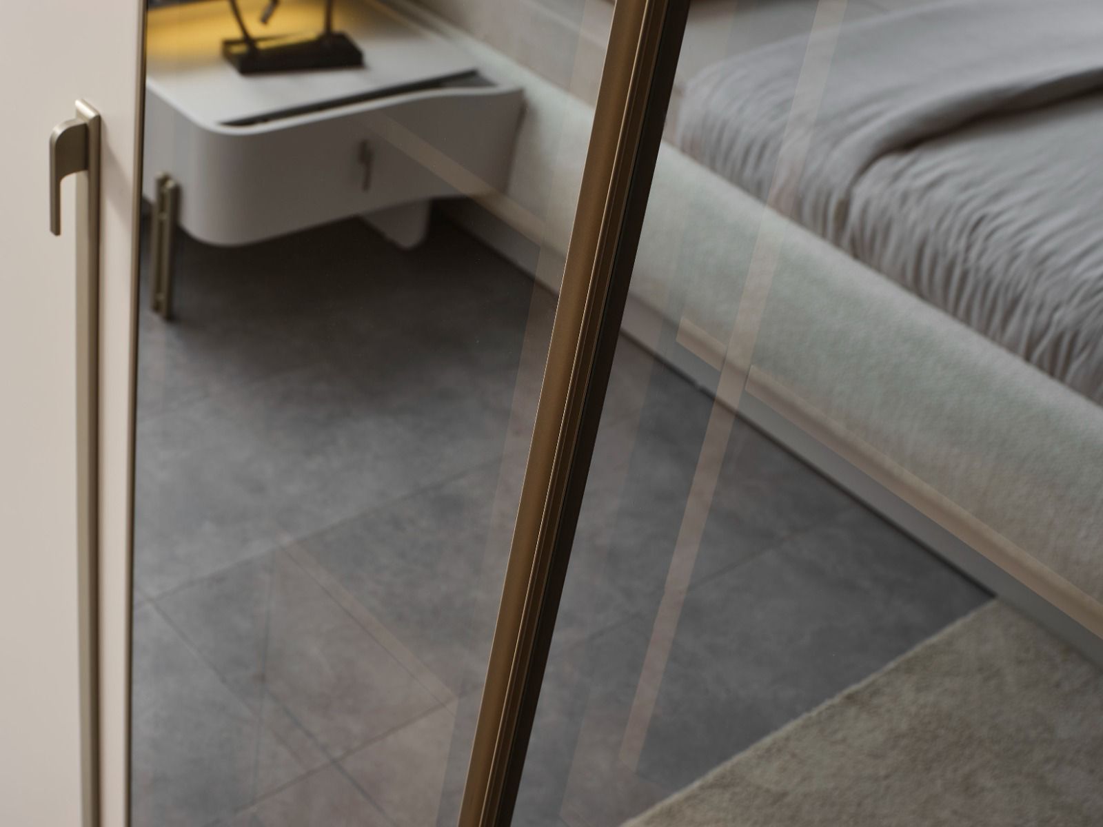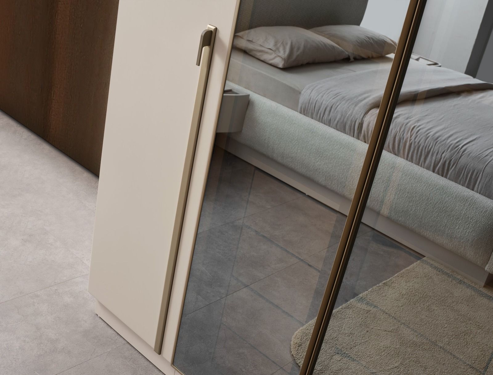 Mit warmen Farbtönen, glänzenden Oberflächen und modernen Details fügt er sich harmonisch in jedes Schlafzimmer ein und verleiht dem Raum ein ruhiges, elegantes Gesamtbild.