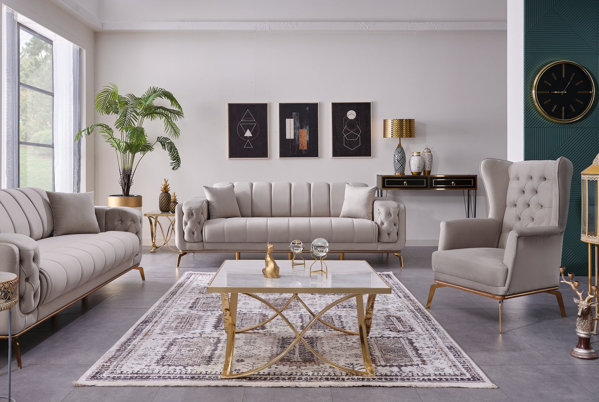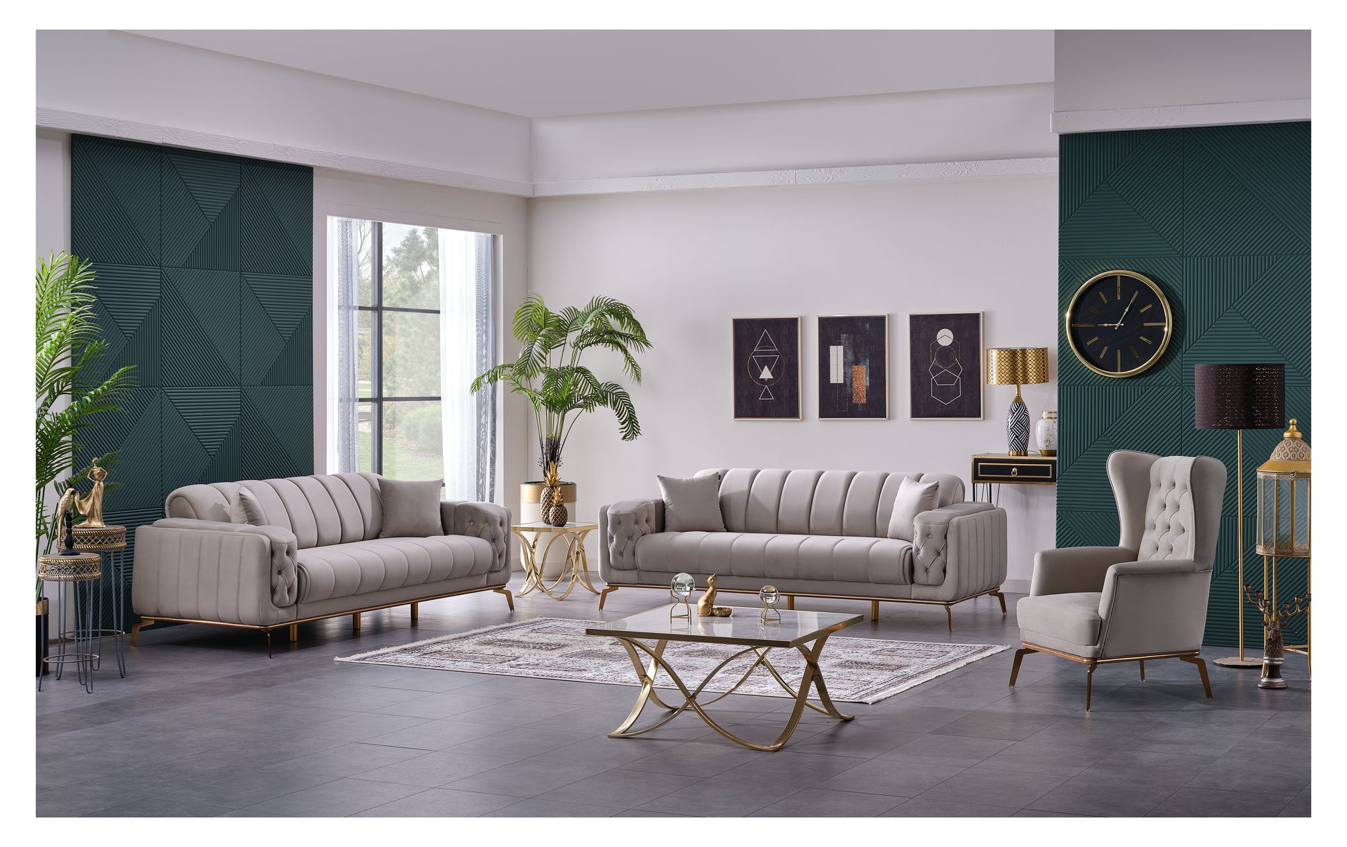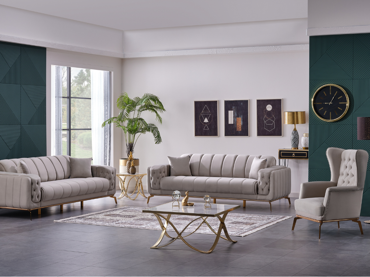 Erleben Sie zeitlose Eleganz und höchsten Sitzkomfort: Das Madrid Sofa-Set wird in sorgfältiger Handarbeit gefertigt, mit edlem Samtbezug, einem robusten Massivholzgestell (FSC-zertifiziert) und stilvollen goldenen Metallakzenten. Die Kombination aus 35-HR Rahmung, komfortabler Gegenschaum-Polsterung und S-Wellenfederung sorgt für dauerhaft angenehmes Sitzen – ideal für anspruchsvolle Wohnräume.