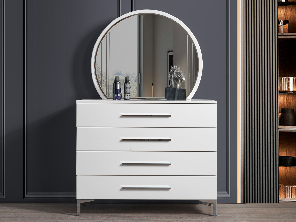 Die elegante weiße Oberfläche und der runde Spiegel verleihen Ihrem Schlafzimmer oder Ankleidebereich eine stilvolle Note.