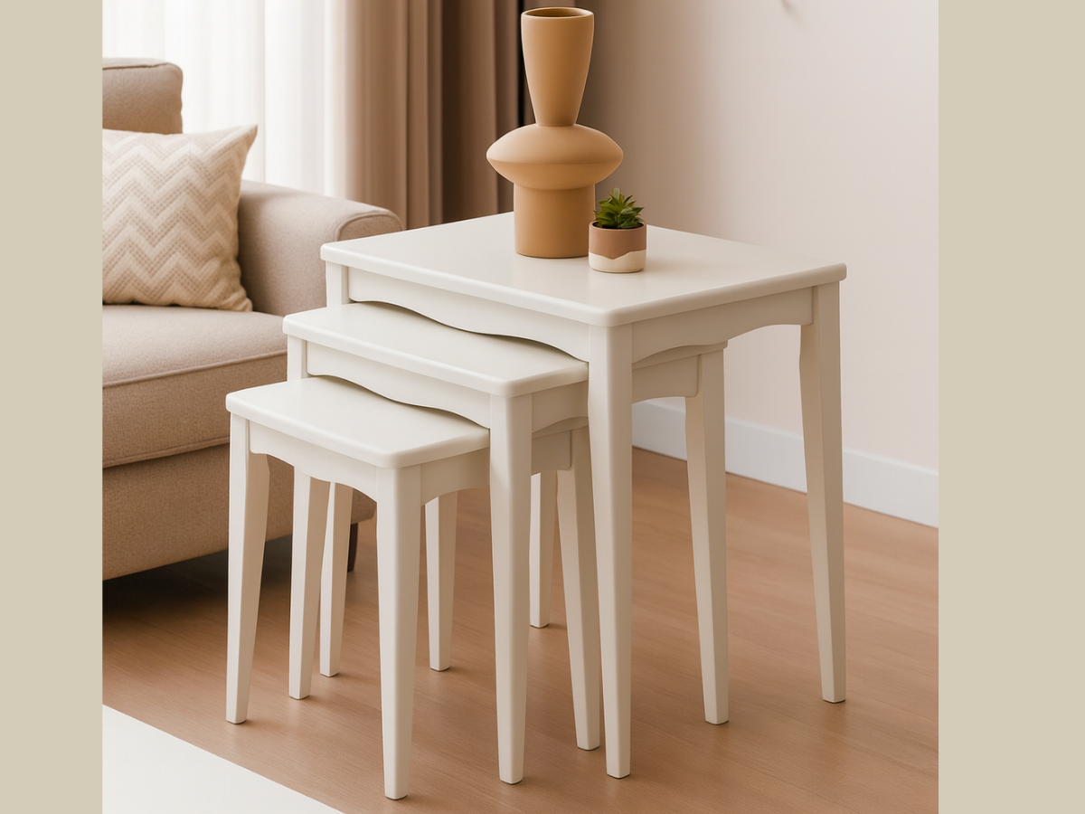 Skandinavisch klar, platzsparend und vielseitig: Melodi bringt mit seiner seidenmatten Weiß-Oberfläche und den harmonischen Rundungen Ruhe in jeden Wohnraum. Die drei Tische lassen sich vollständig ineinanderschieben – ideal als Couch-Beisteller, Kaffeetisch oder dekorative Ablage.