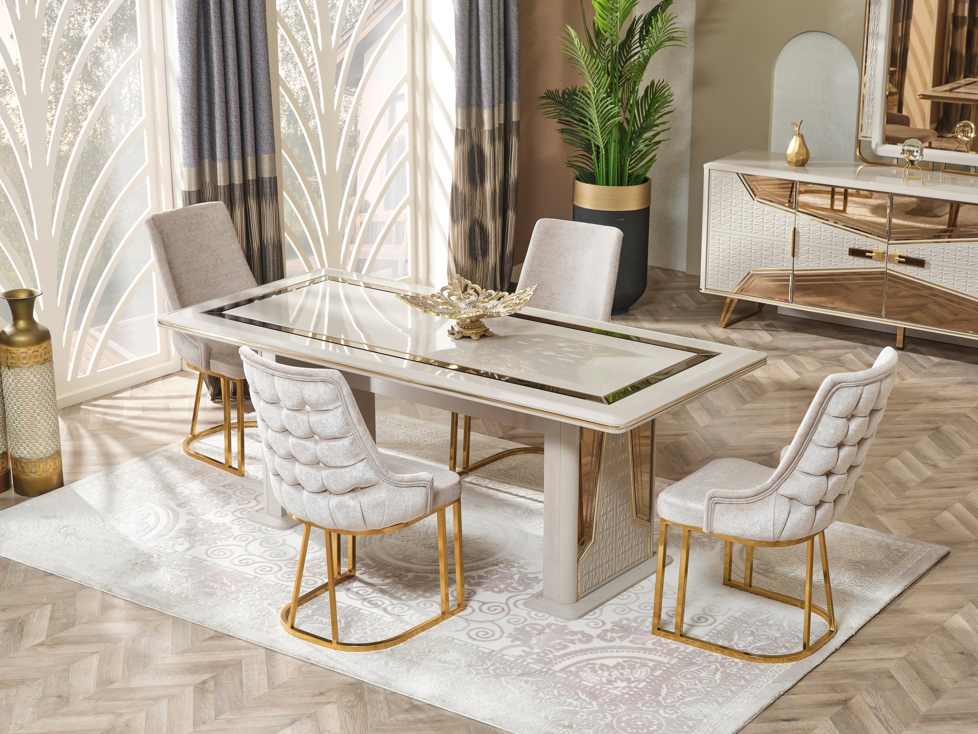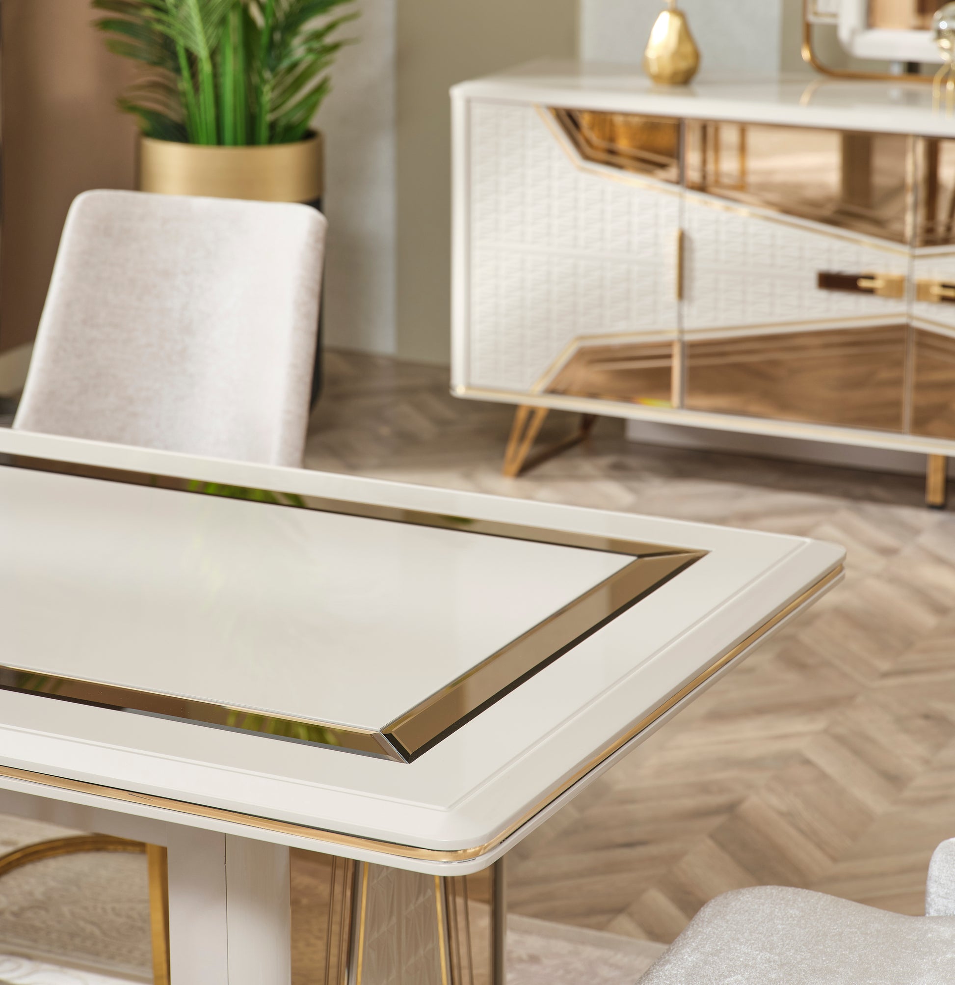 Der Milano Esstisch ist die perfekte Ergänzung zu Ihrem Milano Sideboard und bringt moderne Raffinesse in Ihr Zuhause. Ob im Esszimmer oder Wohnbereich – er schafft eine warme, stilvolle Atmosphäre mit einem Hauch von Luxus.