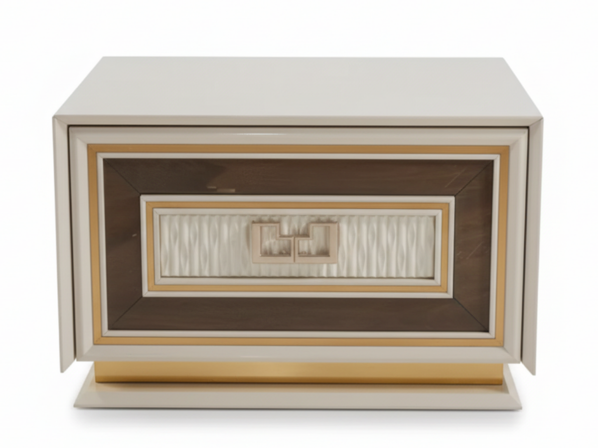 Die Kombination aus Creme-, Braun- und Goldtönen sorgt für ein luxuriöses Erscheinungsbild, während die goldfarbenen Zierleisten und der geometrische Griff einen modernen Akzent setzen.