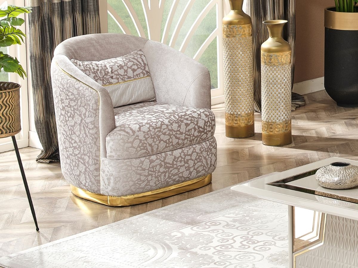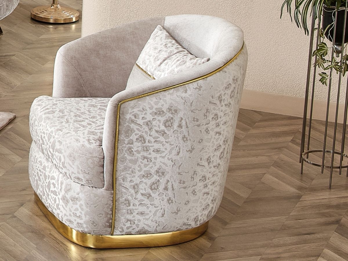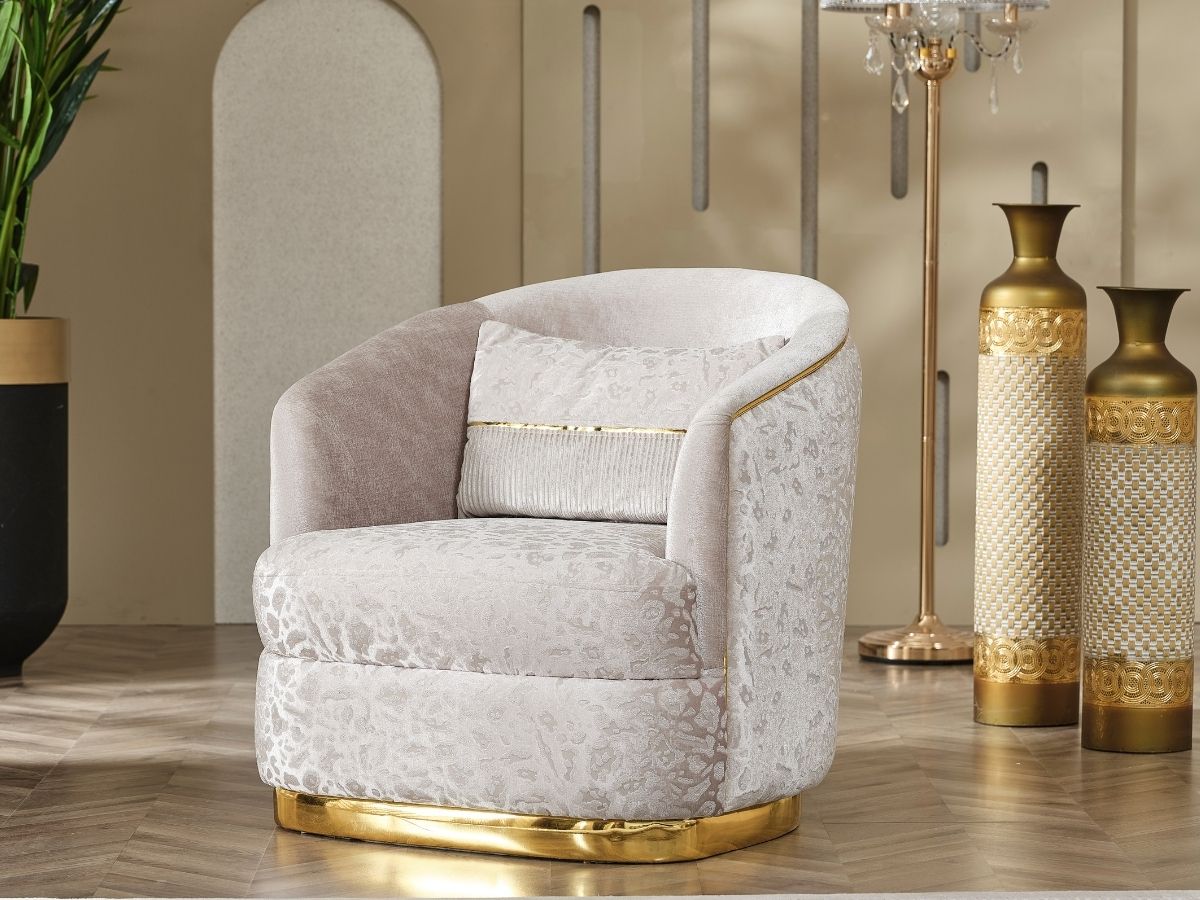 Der Milano Sessel verbindet geschwungene Linien mit einem modernen, minimalistischen Design. Die luxuriösen, goldenen Details und der strukturierte Stoff verleihen diesem Sessel eine edle und stilvolle Ausstrahlung. Dank der hochwertigen Materialien und der bequemen Polsterung ist er die perfekte Wahl für alle, die Eleganz und Komfort in einem Möbelstück vereinen möchten.
