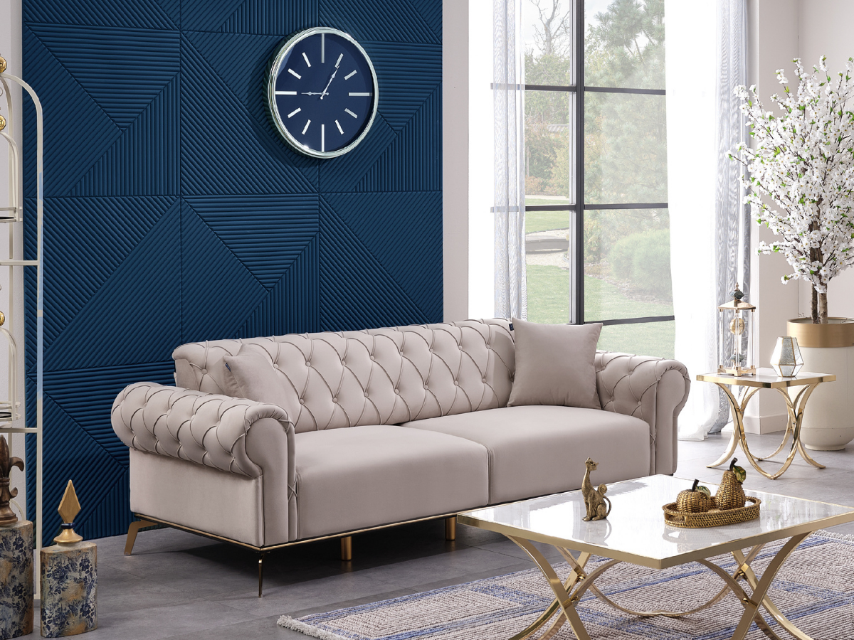 Die Miran Couchgarnitur beeindruckt mit ihrem eleganten Chesterfield-Stil und den edlen Kapitonierungsdetails. Der hochwertige 32-DNS Softschaum bietet langanhaltenden Sitzkomfort, während die S-Federung (No-Sag) für eine gleichmäßige Federung sorgt und ein Einsinken verhindert. Das stabile Massivholzgestell aus Güren (Hainbuche) und die modernen Metallfüße verleihen dem Sofa-Set Robustheit und ein zeitloses Design.