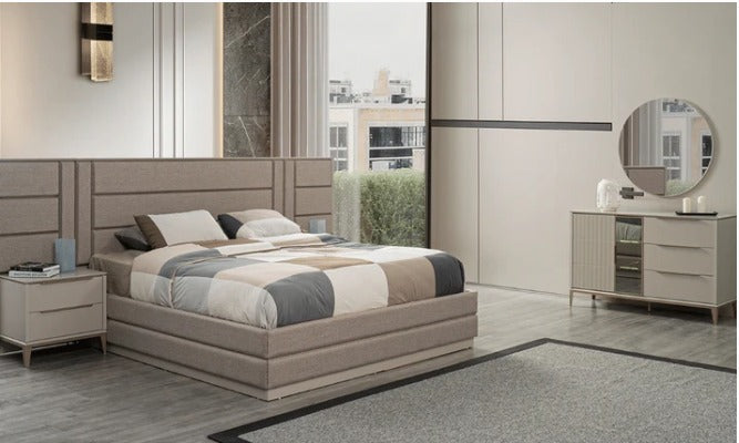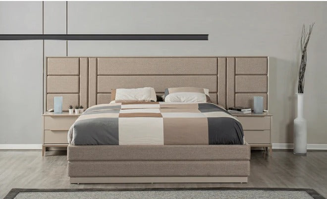 Das gepolsterte Kopfteil mit seinen klaren Linien schafft eine ruhige und stilvolle Atmosphäre, während der integrierte Bettkasten dank des leicht zu öffnenden Mechanismus großzügigen Stauraum für Decken, Kissen und Bettwäsche bietet.