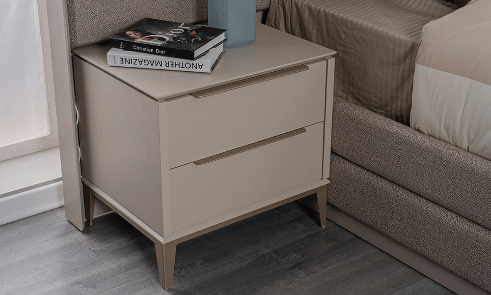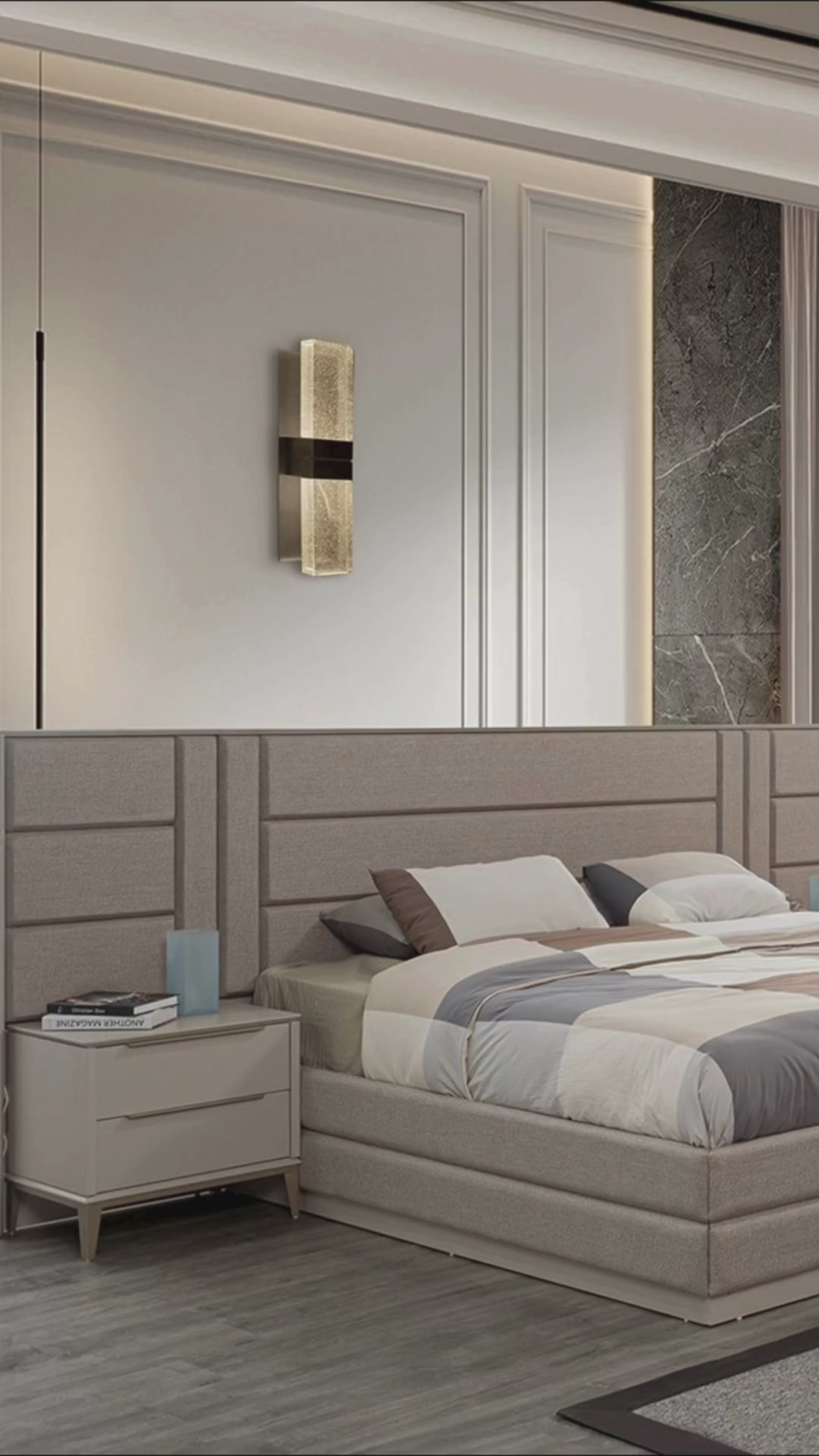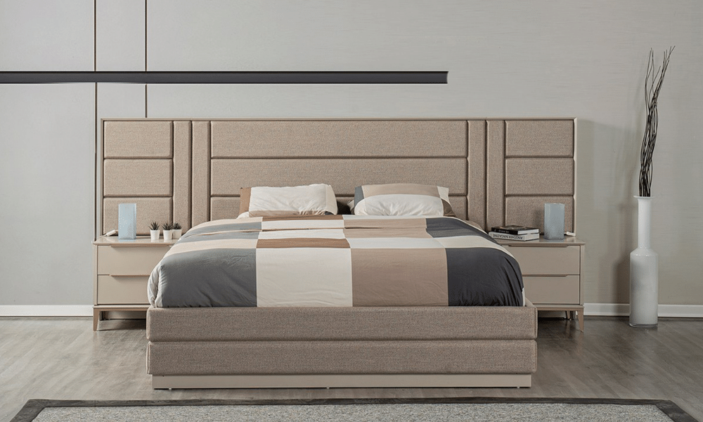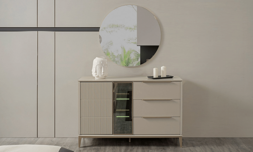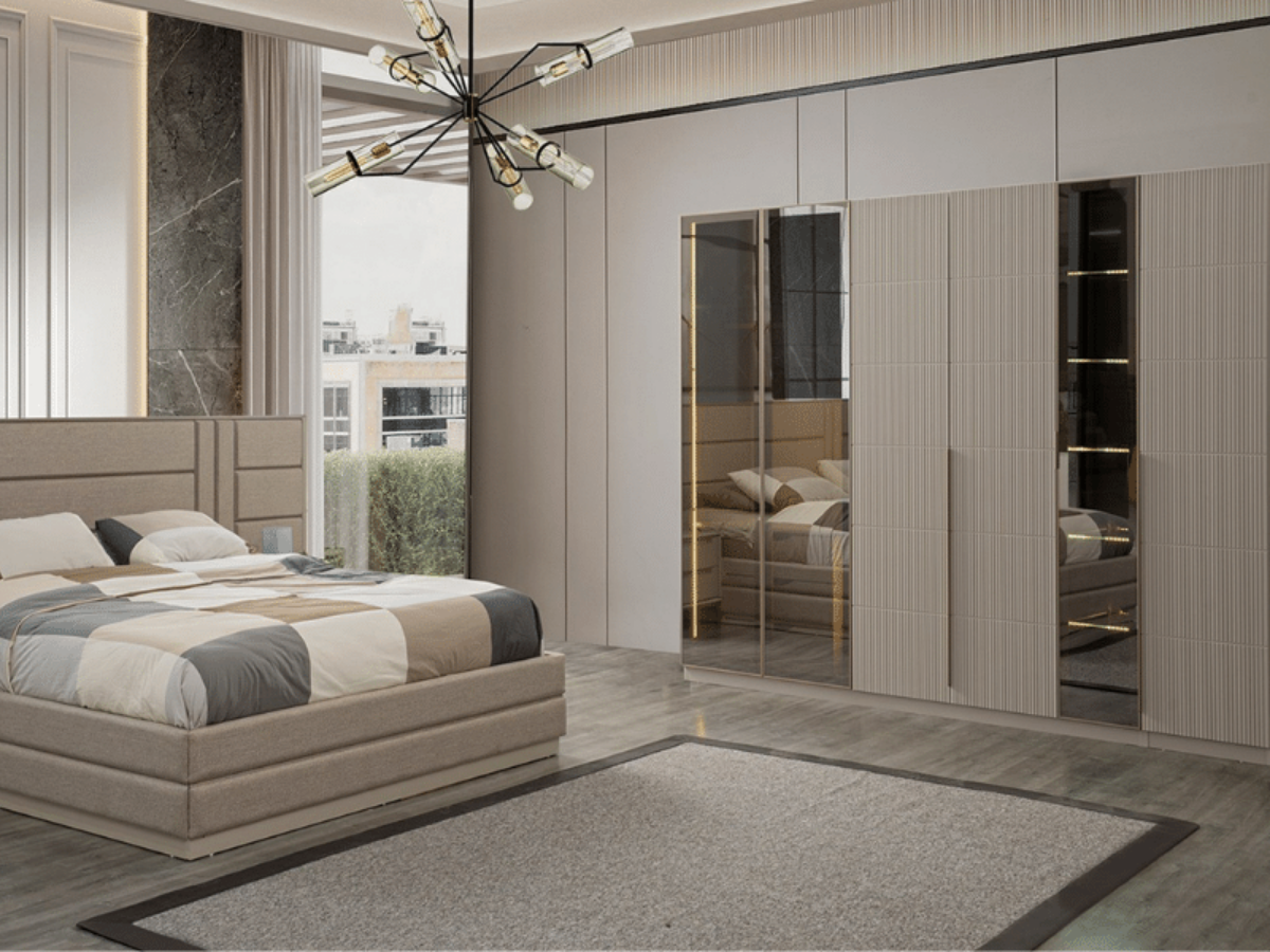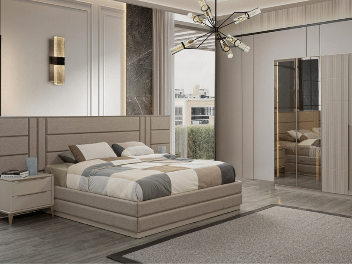 Das Nepal Schlafzimmer Set beeindruckt mit eleganten Selenit-Oberflächen, feinen mattgoldenen Griffen und einem modernen Gesamtbild. Das gepolsterte Bett mit Bettkasten bietet praktischen Stauraum, während der große Schwebetürenschrank und der Schminktisch mit Spiegel den Schlafbereich perfekt ergänzen.