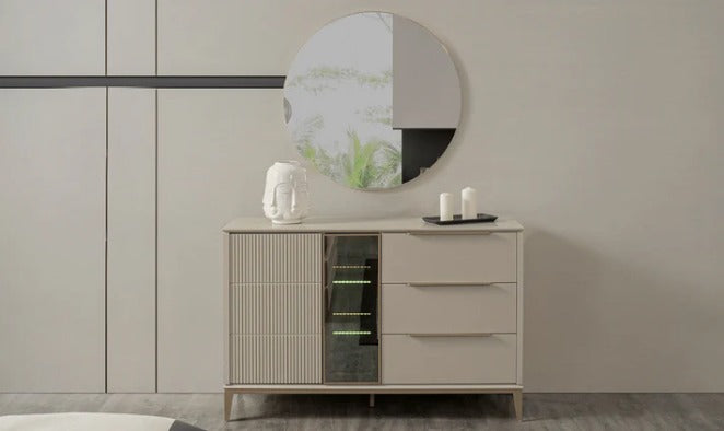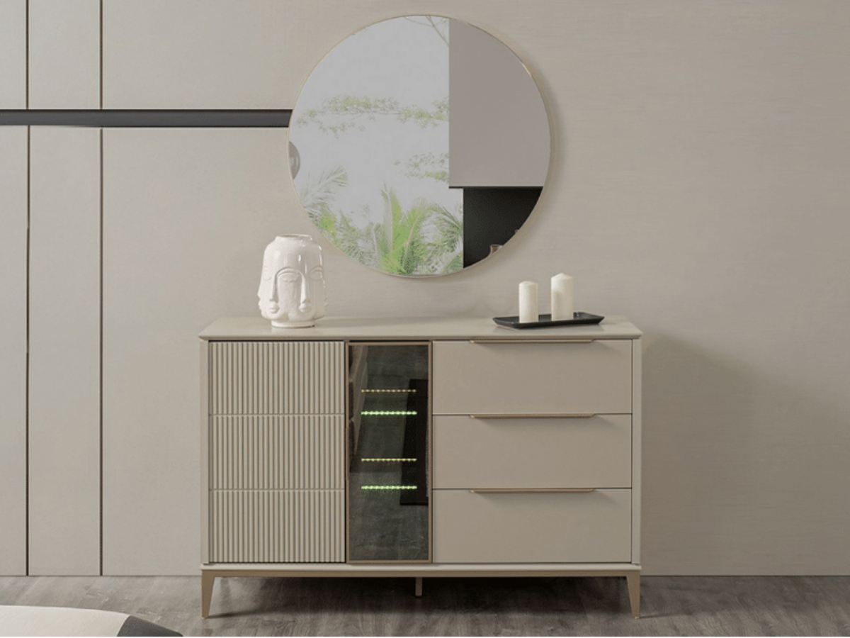Der runde Spiegel ergänzt das elegante Gesamtbild und macht diese Kommode zum stilvollen Highlight Ihres Raumes.