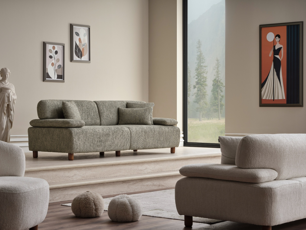Modern und langlebig: Der hochwertige Chenille-Bezug bietet eine weiche Haptik und ist zugleich pflegeleicht. Der robuste Rahmen aus Sperrholz und Buchenholz sorgt für Stabilität.