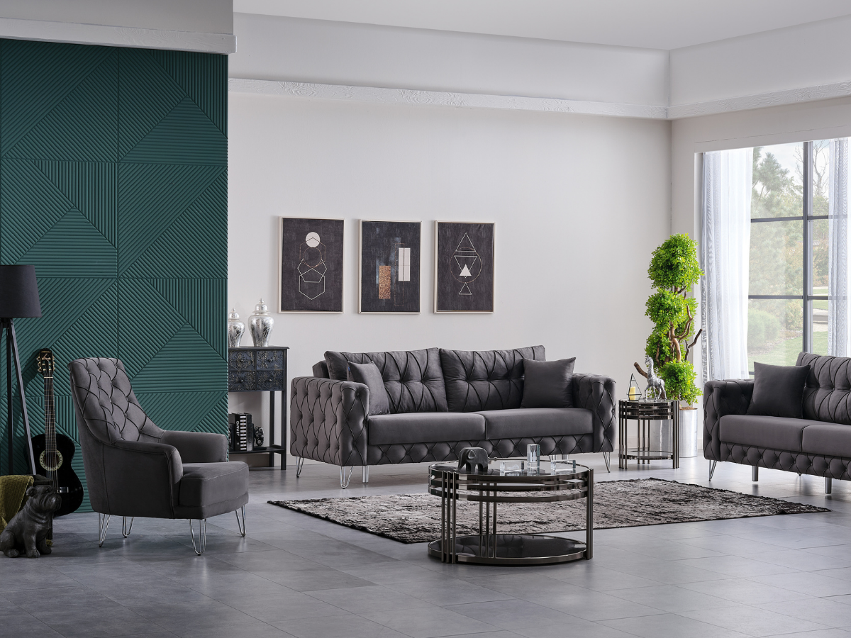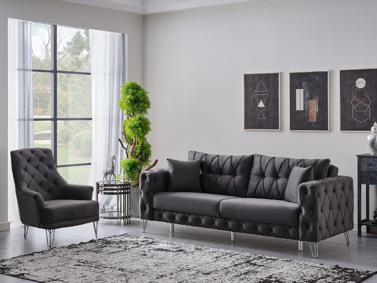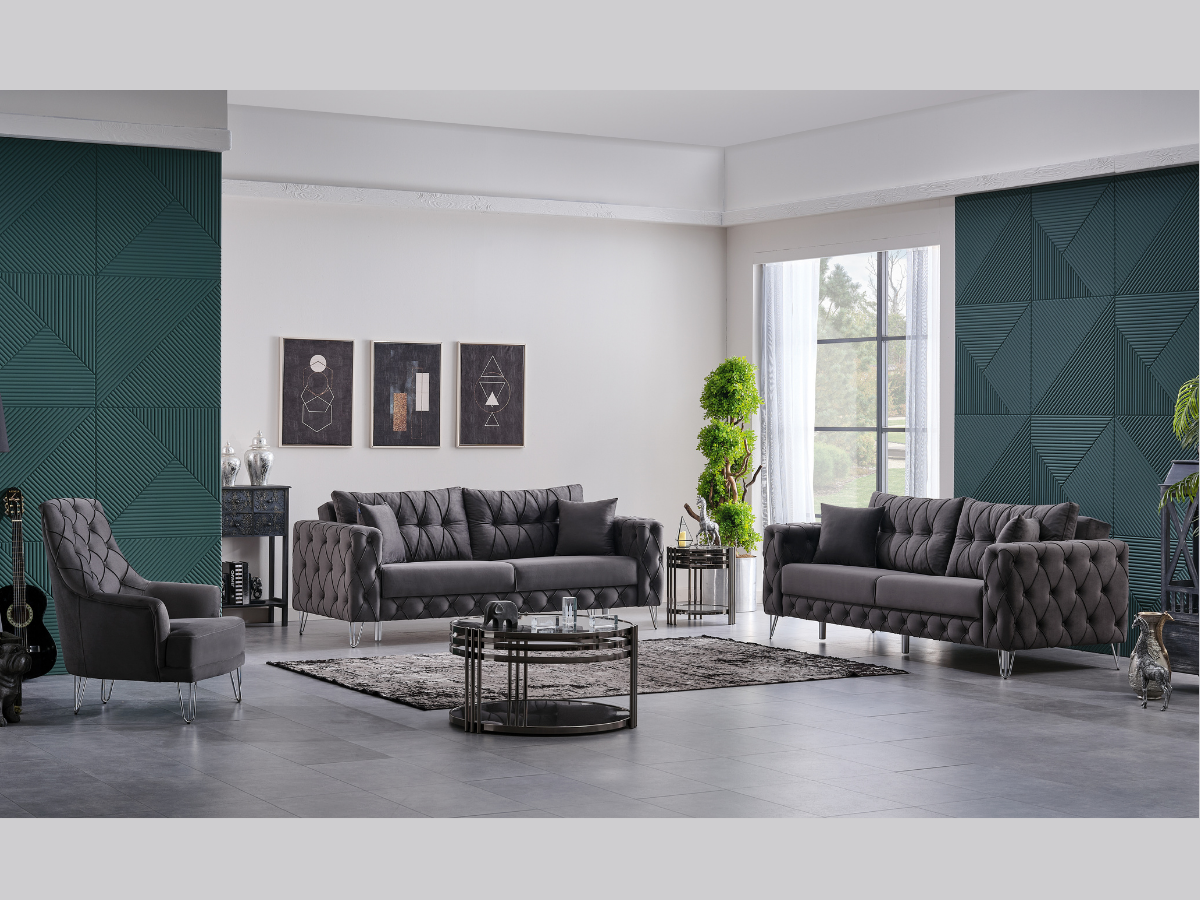Mit dem edlen Stoff Mila 32 Anthrazit passt die Parma Garnitur perfekt in stilvolle Wohnräume und vereint Komfort mit exklusivem Design.