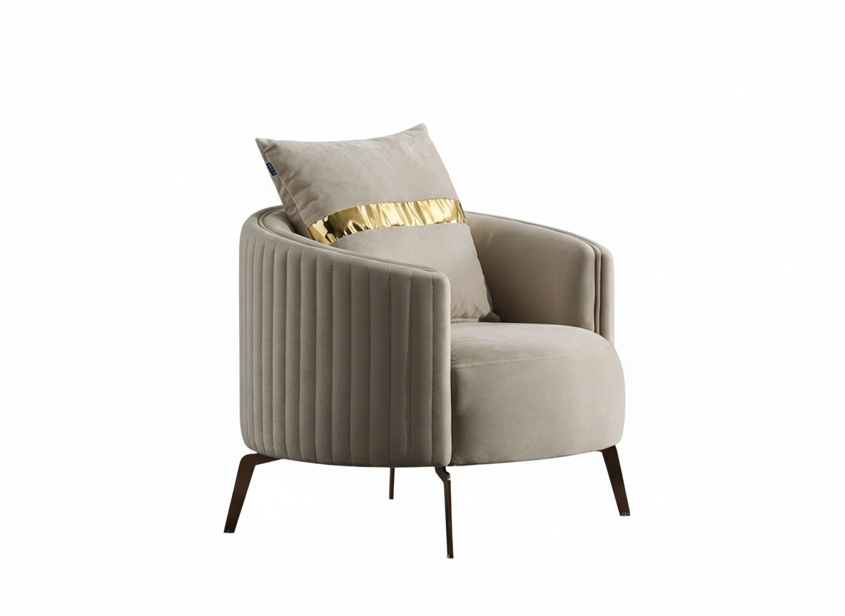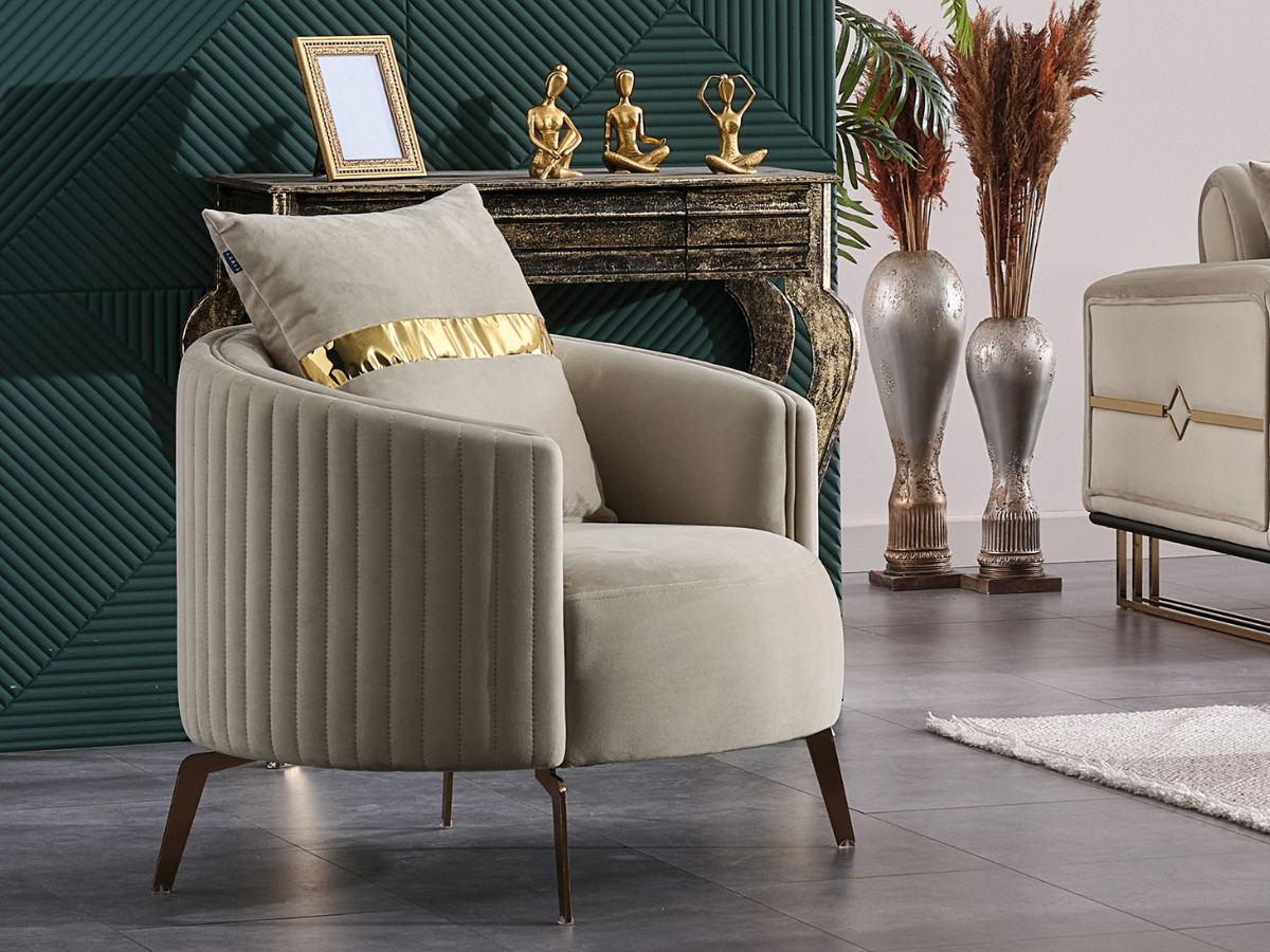 Eleganter Sessel mit Vertikalsteppung & goldfarbenen Metallfüßen.
