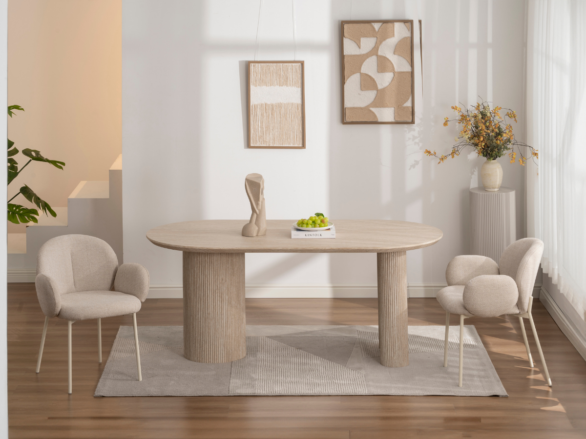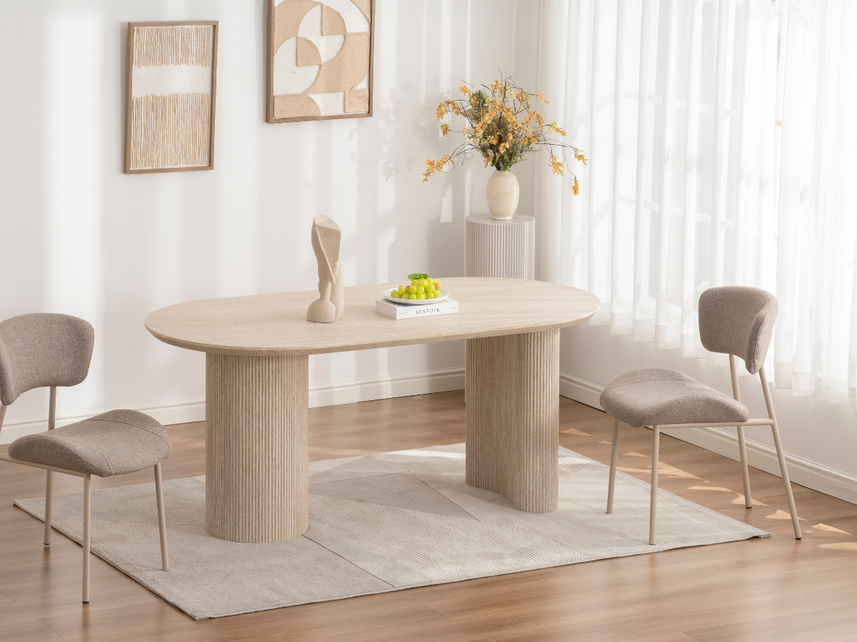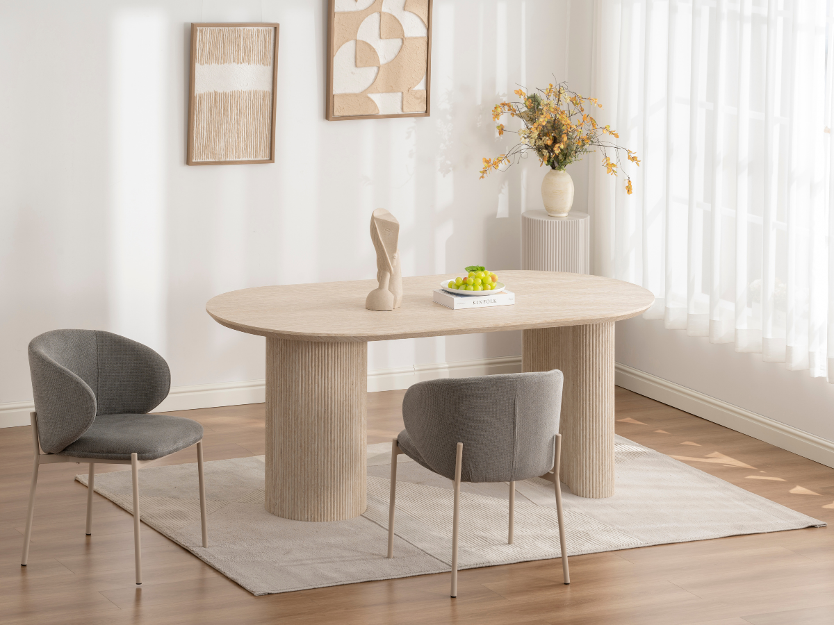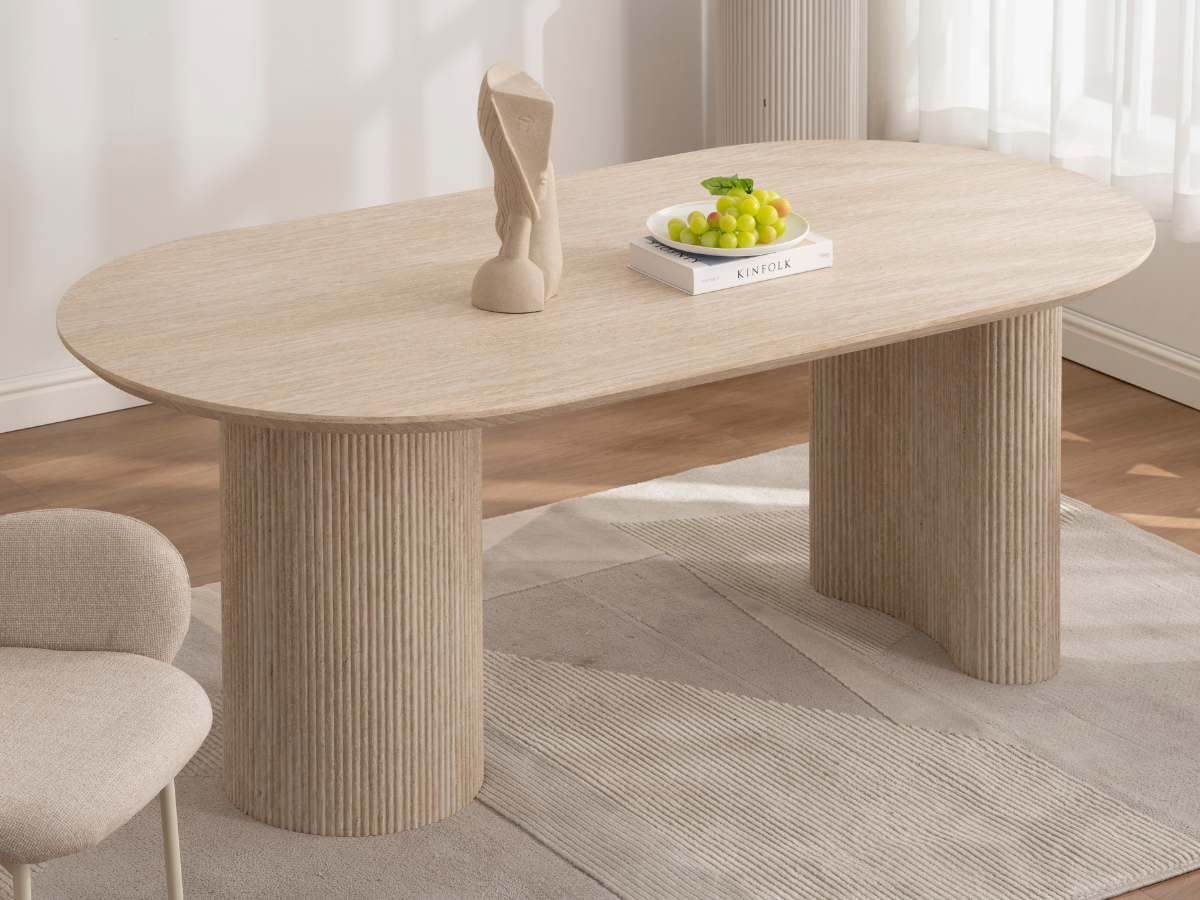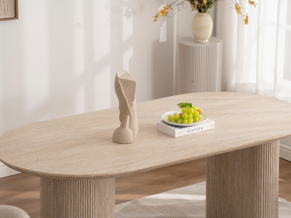 Der Porto Esstisch kombiniert moderne Formen mit der warmen Travertin-Optik und verleiht jedem Raum ein edles, architektonisches Flair. Seine markanten Rillenfüße und die ovale Tischplatte schaffen eine harmonische Balance zwischen Design und Funktionalität – ideal für stilvolle Essbereiche und offene Wohnräume.
